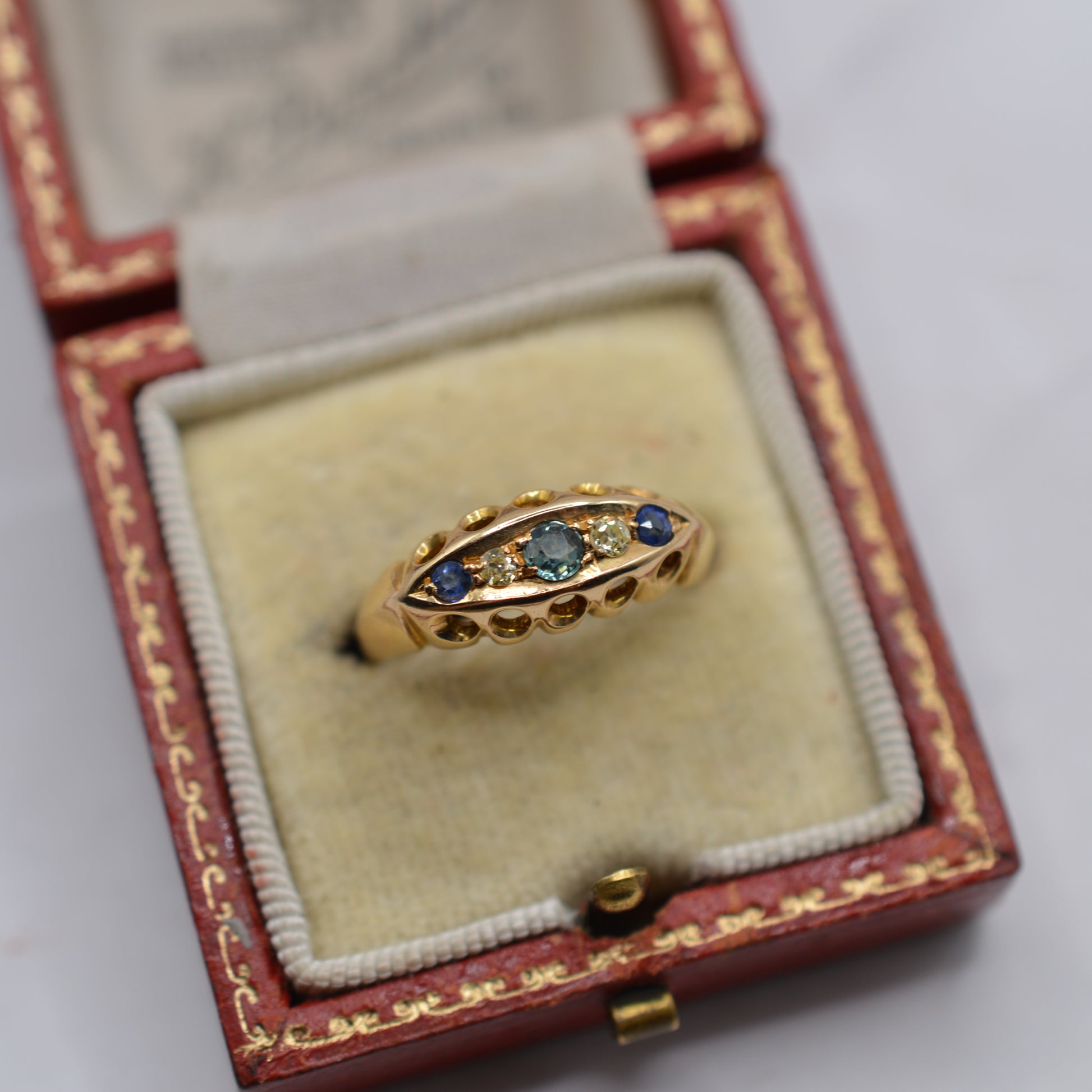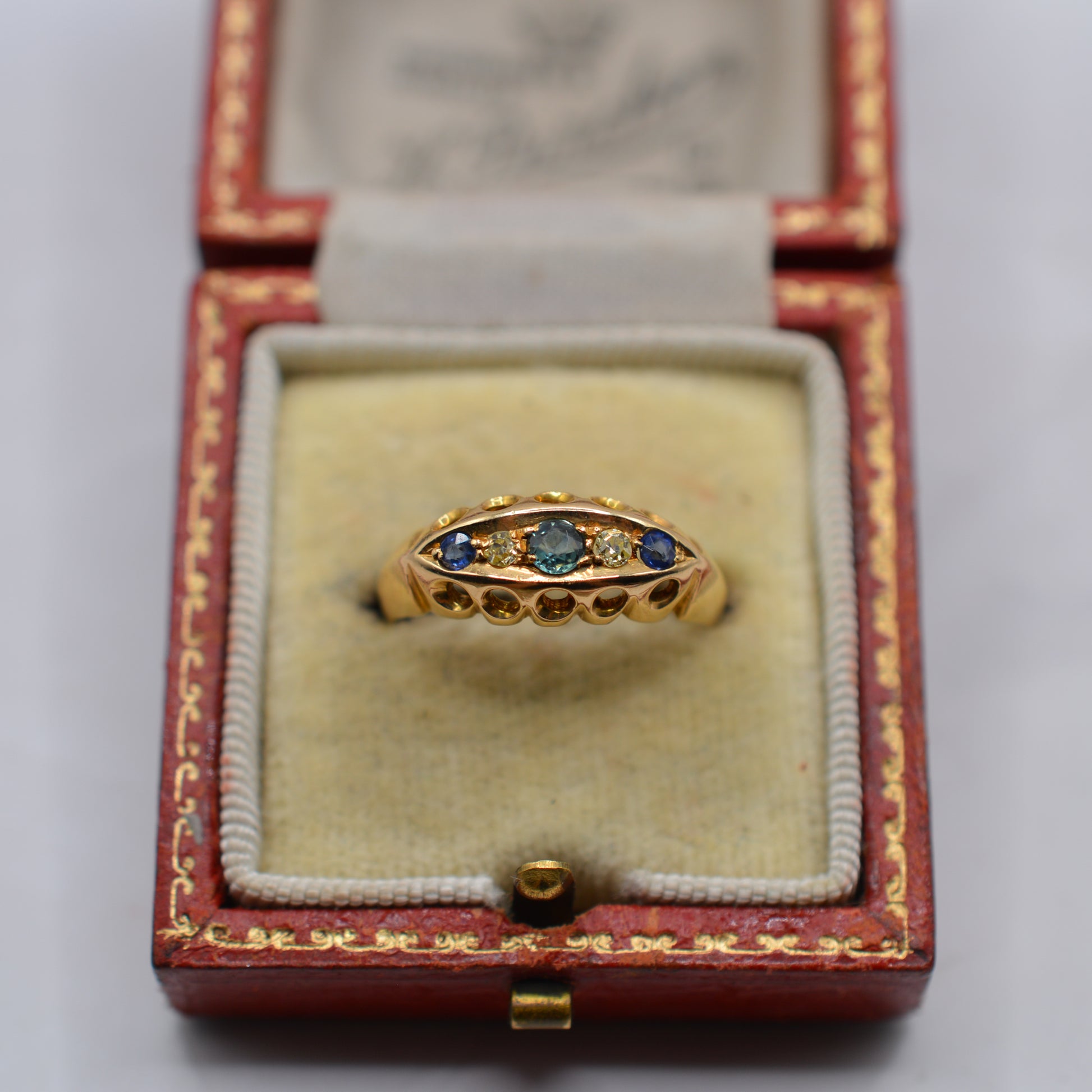 Antique 1915 18ct Gold Sapphire & Diamond Five-Stone Gypsy Ring