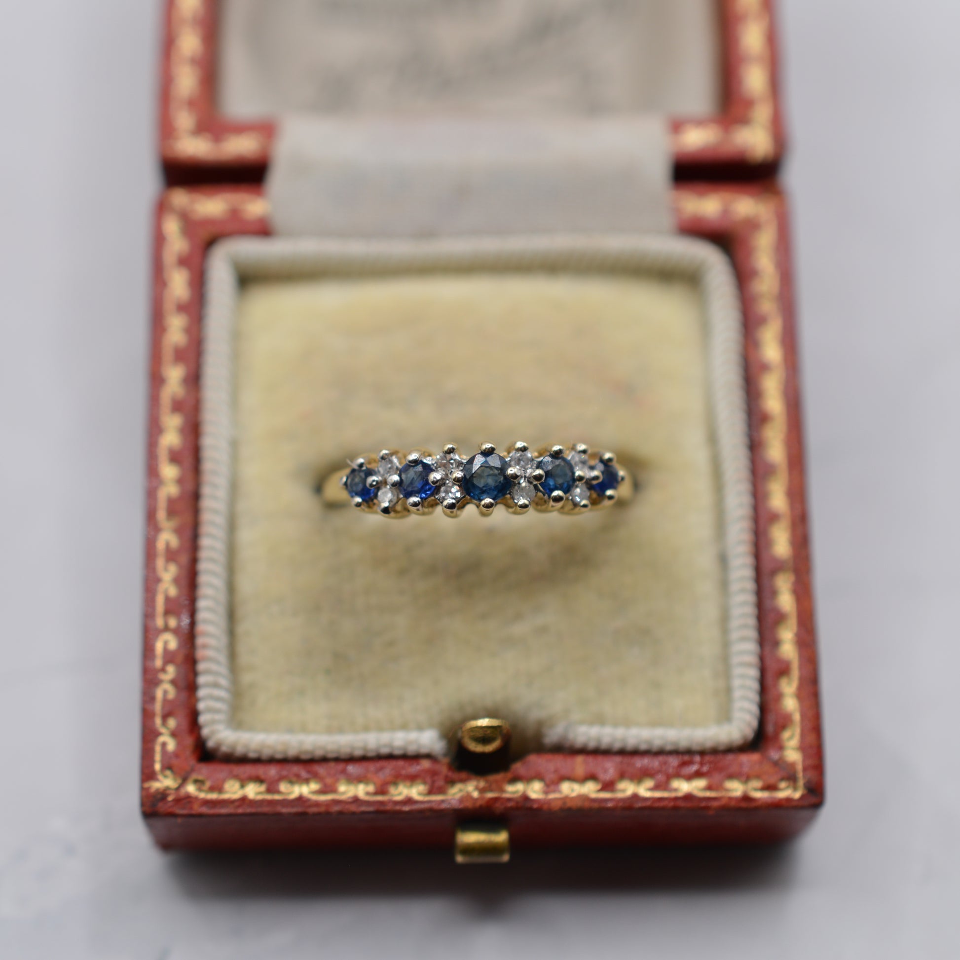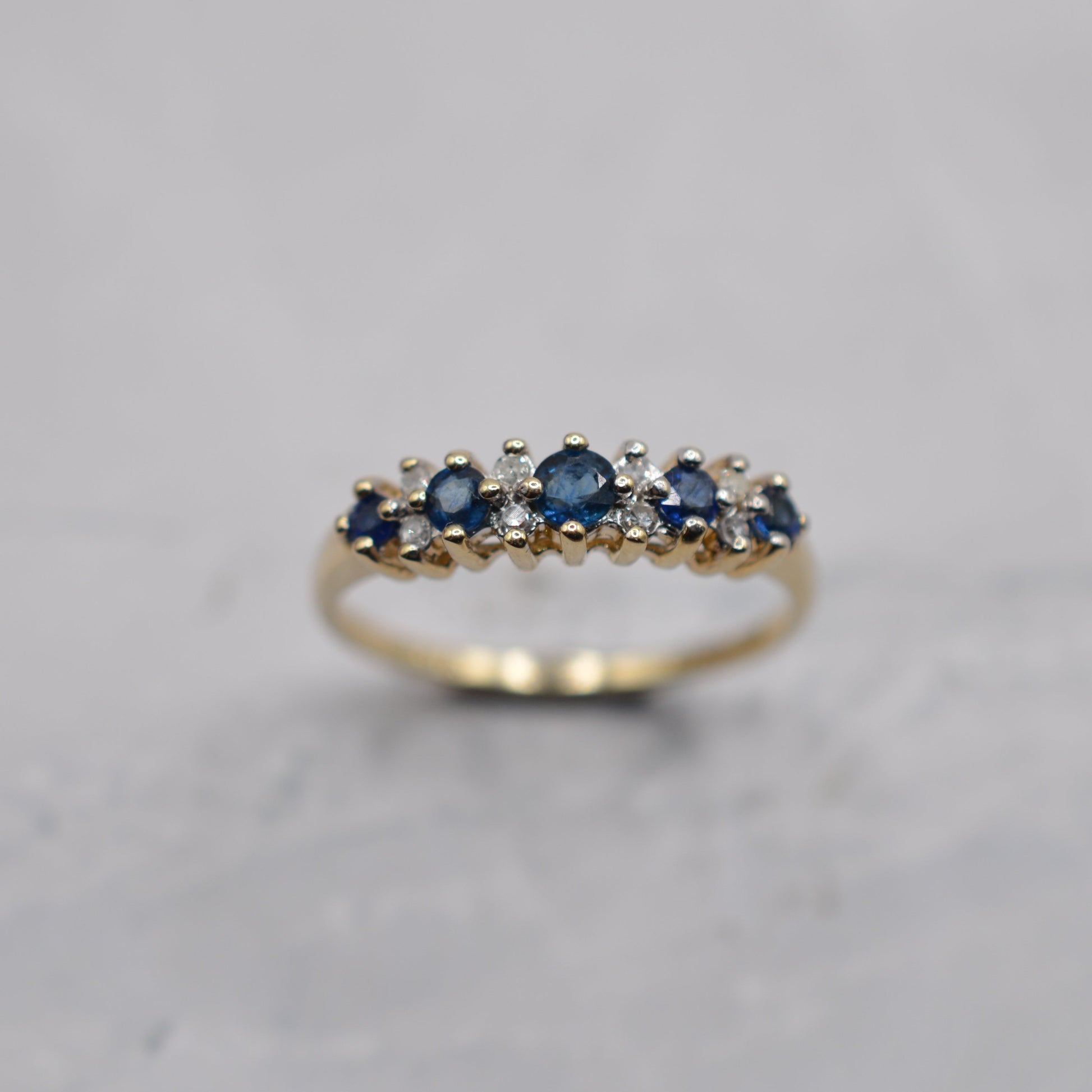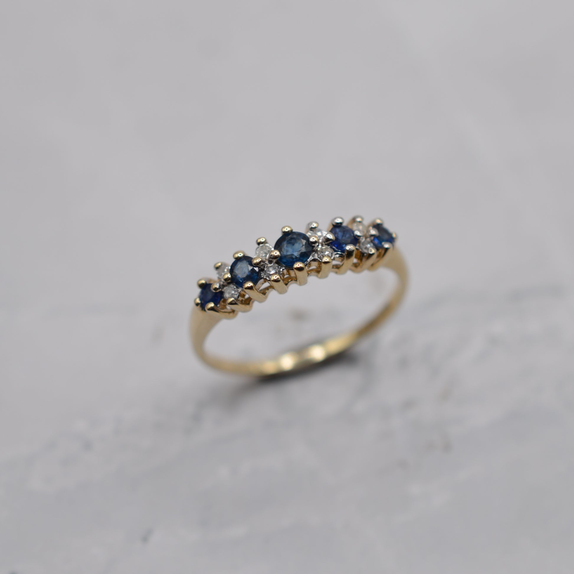 A beautiful 9ct gold sapphire and diamond half-eternity ring. This lovely piece features five round blue sapphires in a sea-blue tone, interspaced with little diamond accents for extra sparkle, all set in a luminous yellow gold band. It's a lightweight, minimalist ring that looks beautiful worn alone or stacked with others.