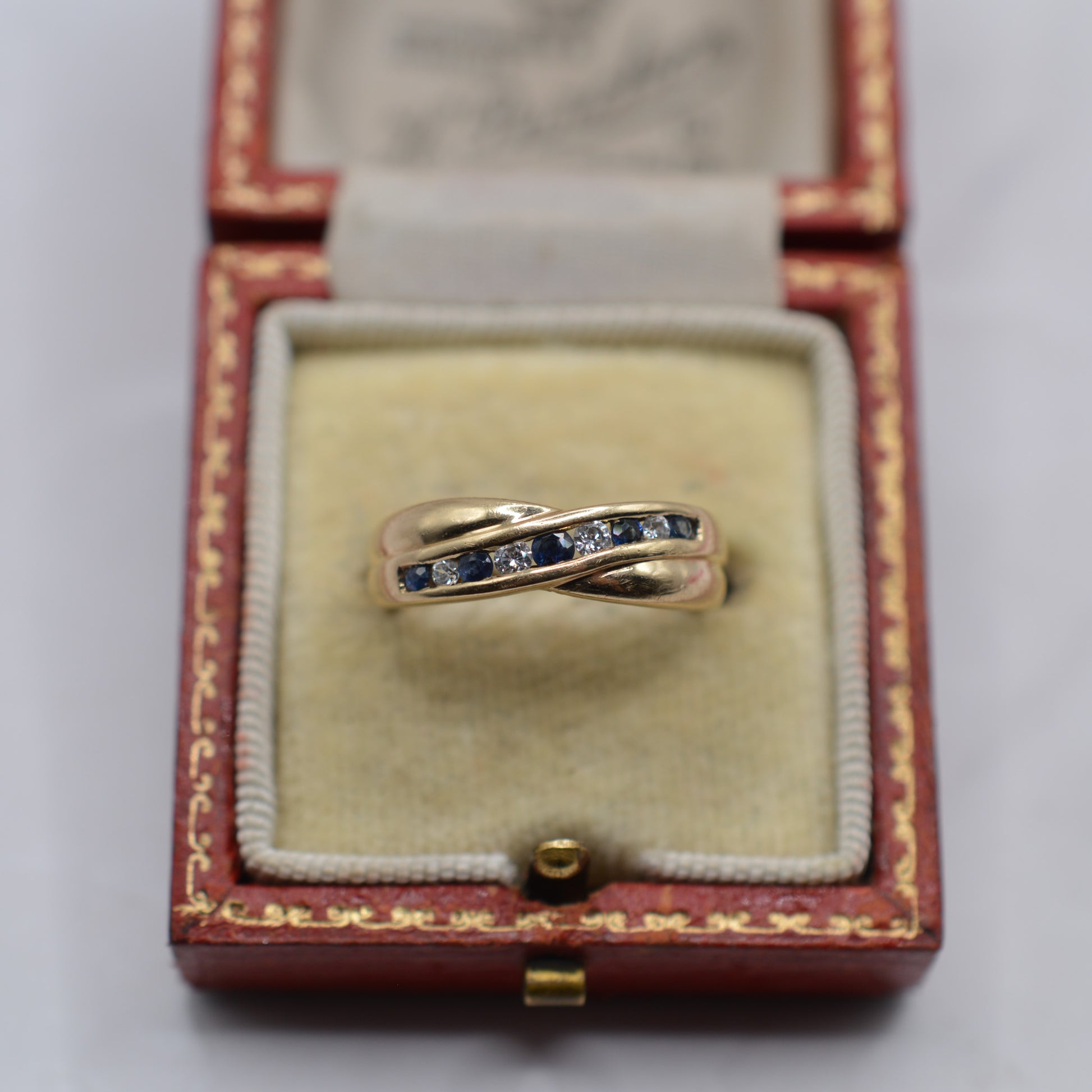 A sweet and versatile vintage 9ct gold crossover ring! This elegant piece features a sleek, channel-set twist design with alternating dark blue sapphires and sparkly cubic zirconia -- a wonderful blend of a half-eternity and crossover ring. Whether worn solo or stacked with other favourites, this is a super cute and classic addition to any vintage ring collection.