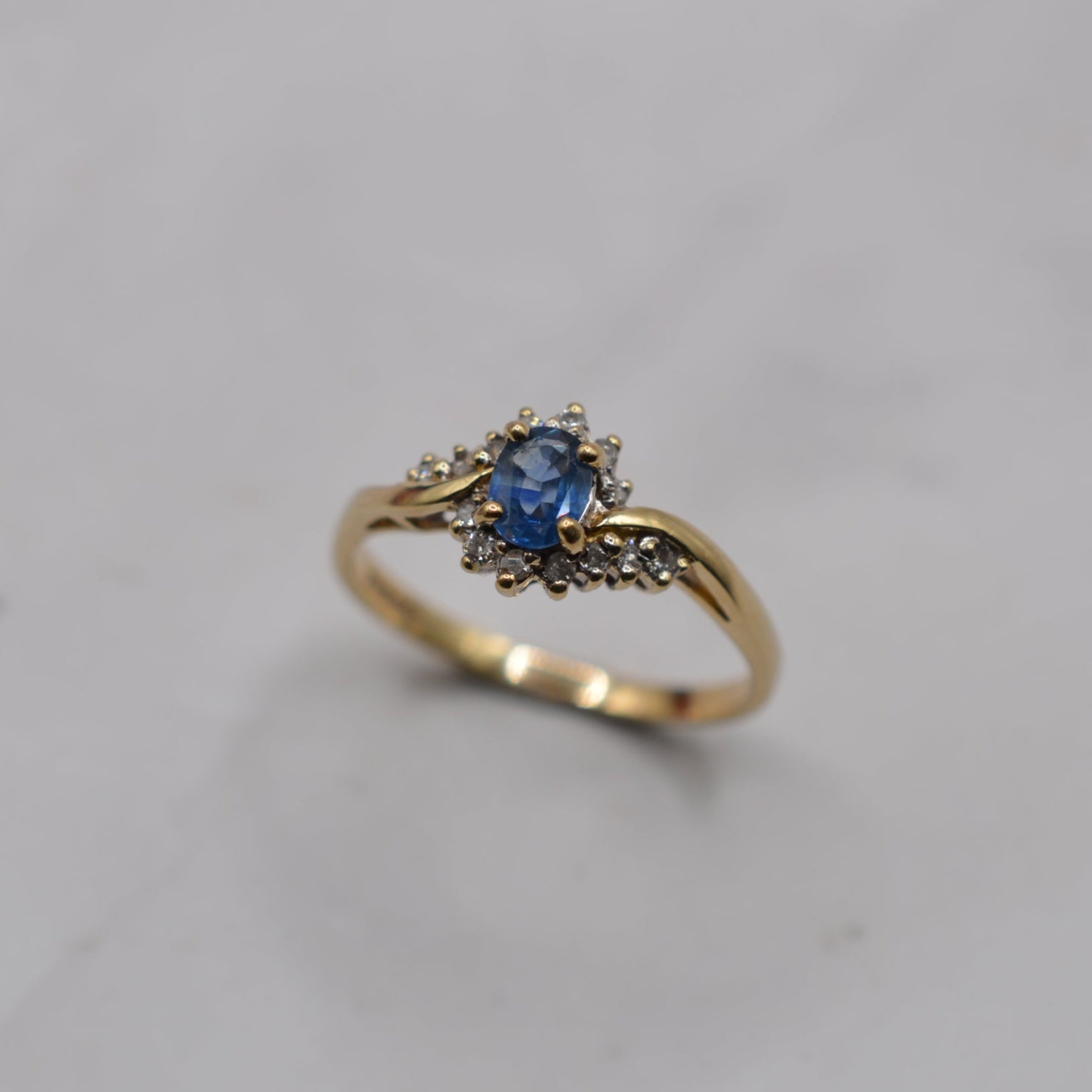 A very pretty 9ct gold sapphire & diamond cluster ring in a crossover design! This adorable piece features a beautiful oval-shaped sapphire in a desirable cornflower shade of blue, bordered by a halo of little sparkling diamonds. The crossover shoulders are also accented with diamonds, adding extra sparkle and luxury. A charming little ring that works perfectly for everyday wear or as a delicate special occasion piece.