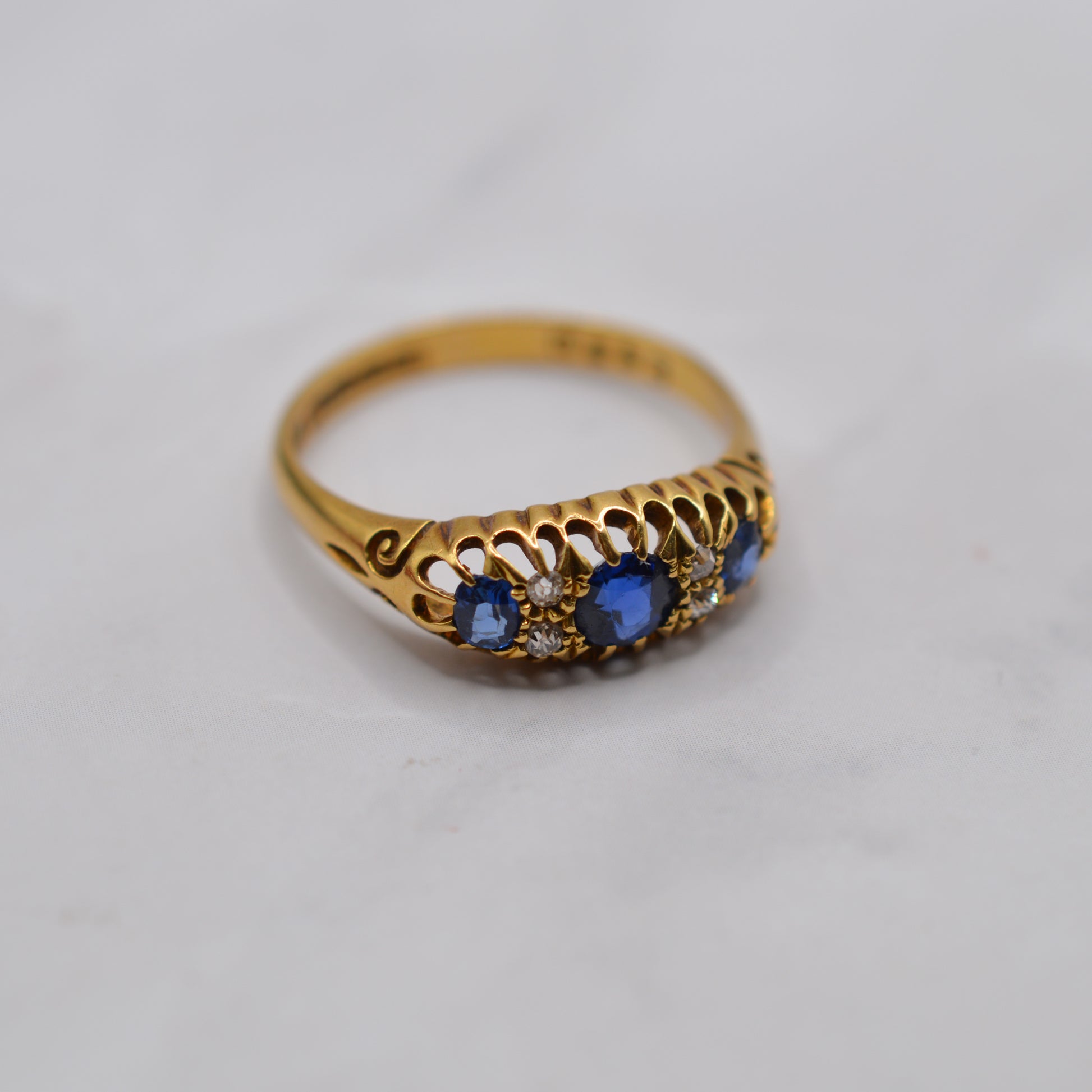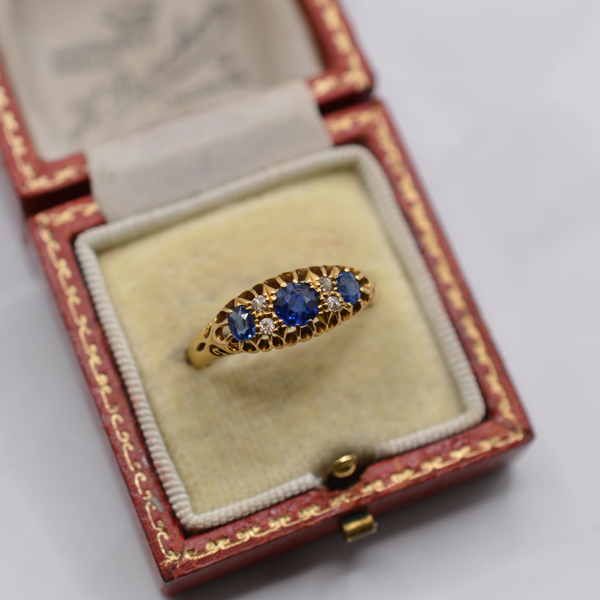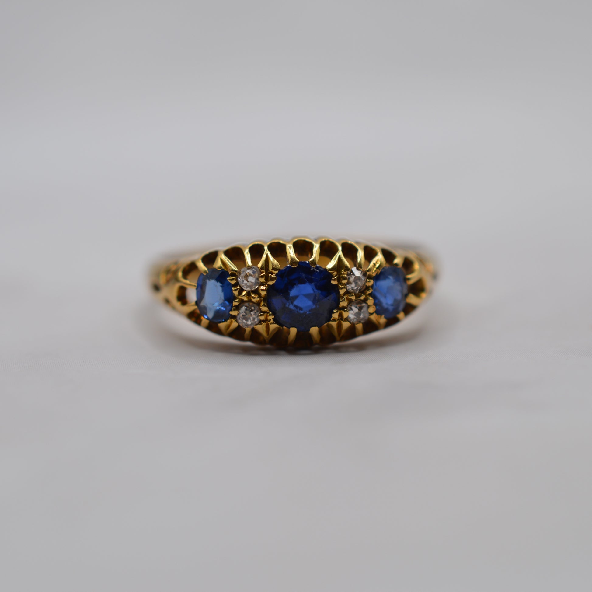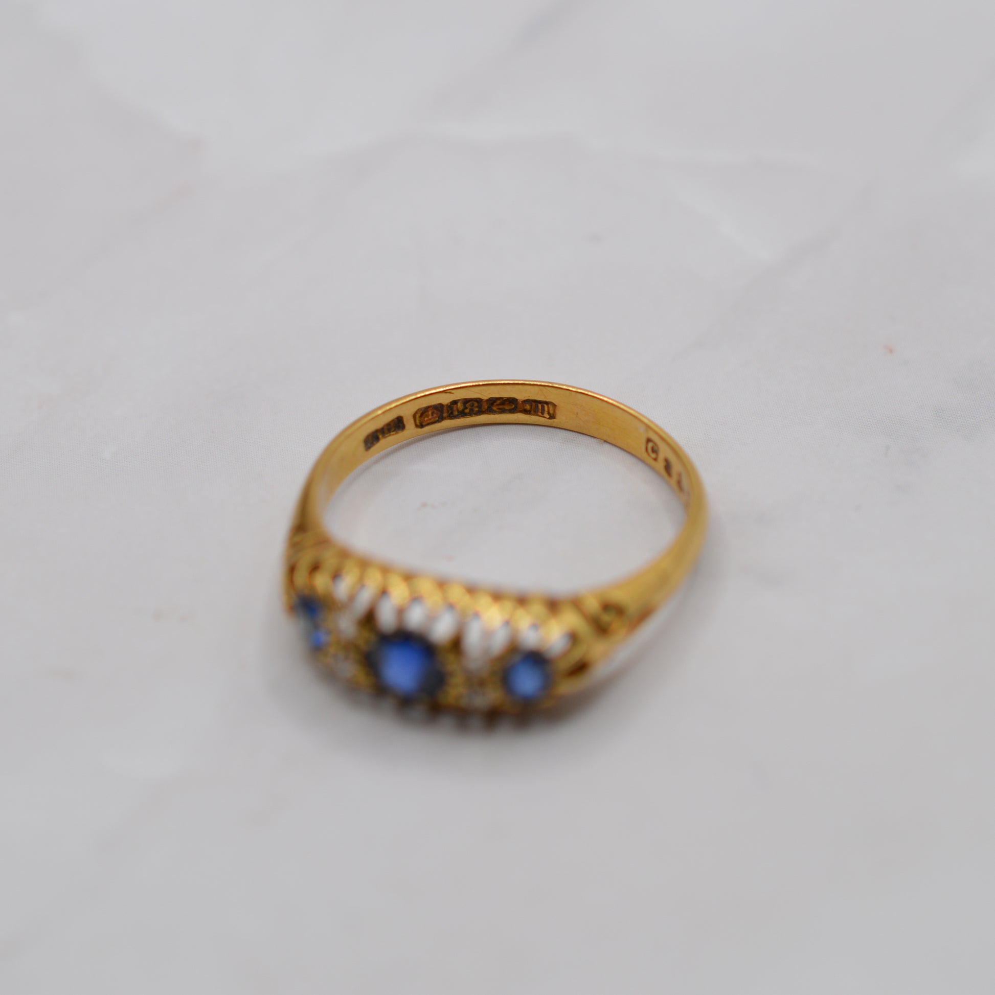 An utterly beeeautiful antique 18ct gold boat ring from 1911, right on the cusp of the Edwardian and George V eras. This stunning piece features three bold gypsy-set blue sapphires — the central sapphire being the largest at approx. 4mm — interspaced with four sparkling cushion-shaped diamonds, making seven gemstones in total. The sapphires display a warm cornflower-blue shade, with the central stone slightly darker and richer due to its larger size. The boat-shaped setting itself measures approx. 15mm x 7mm, with subtle swirl-engraved shoulders completing the design. A gorgeous example of Edwardian craftsmanship, full of buttery yellow gold, sparkly stones and historical charm.
