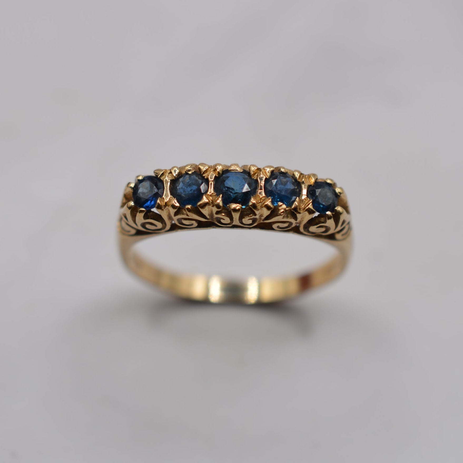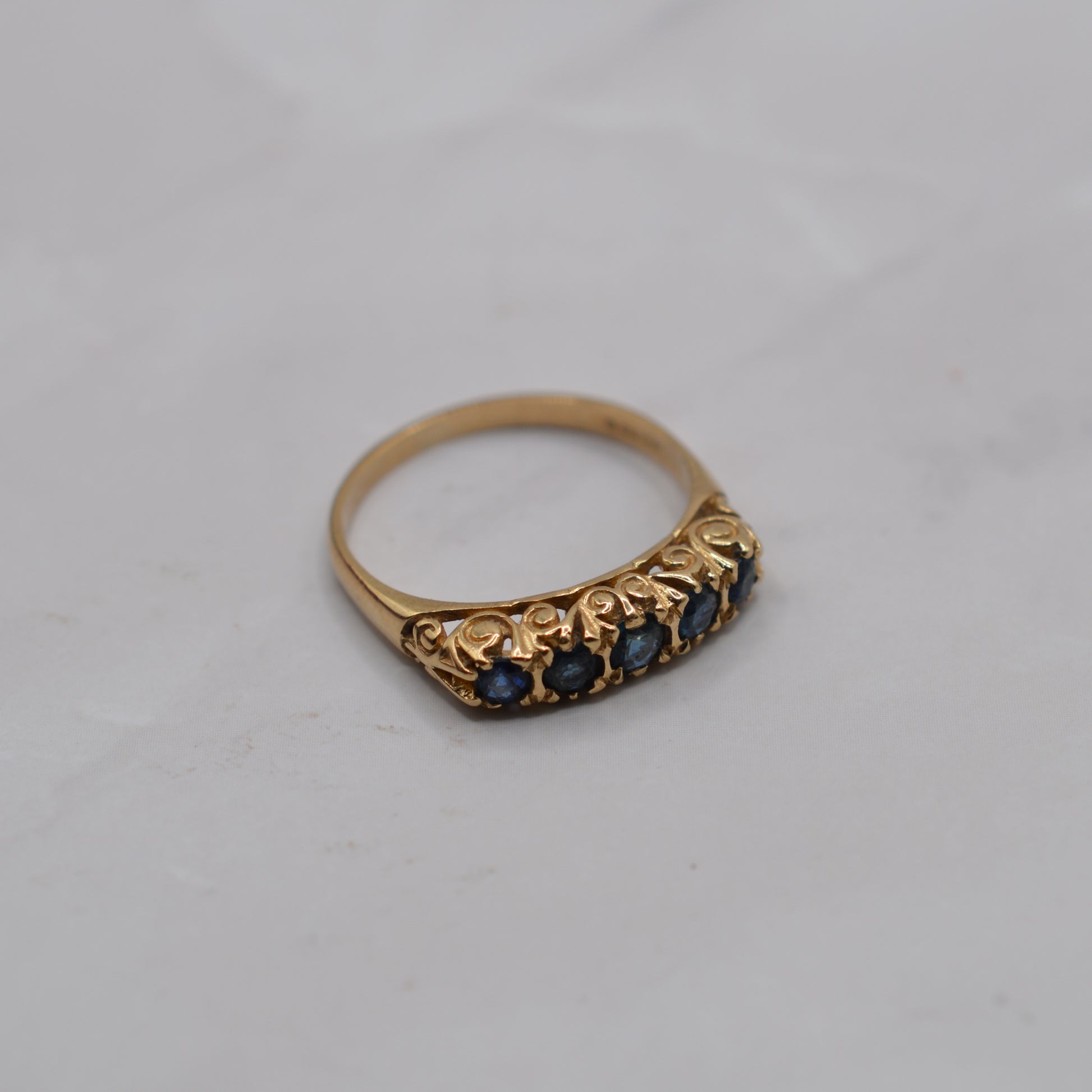 Such a beauuuutiful vintage 9ct gold sapphire five-stone ring! This classic 1970s piece features a row of five round sapphires, each in a warm deep blue and offering lovely sparkle. The gemstones are set in a lovely swirl-pierced gallery, a staple feature inspired by Victorian ring design. A timeless and elegant piece, perfect for the sapphire lovers, those who love half-eternity rings, or as a birthstone gift for September souls!