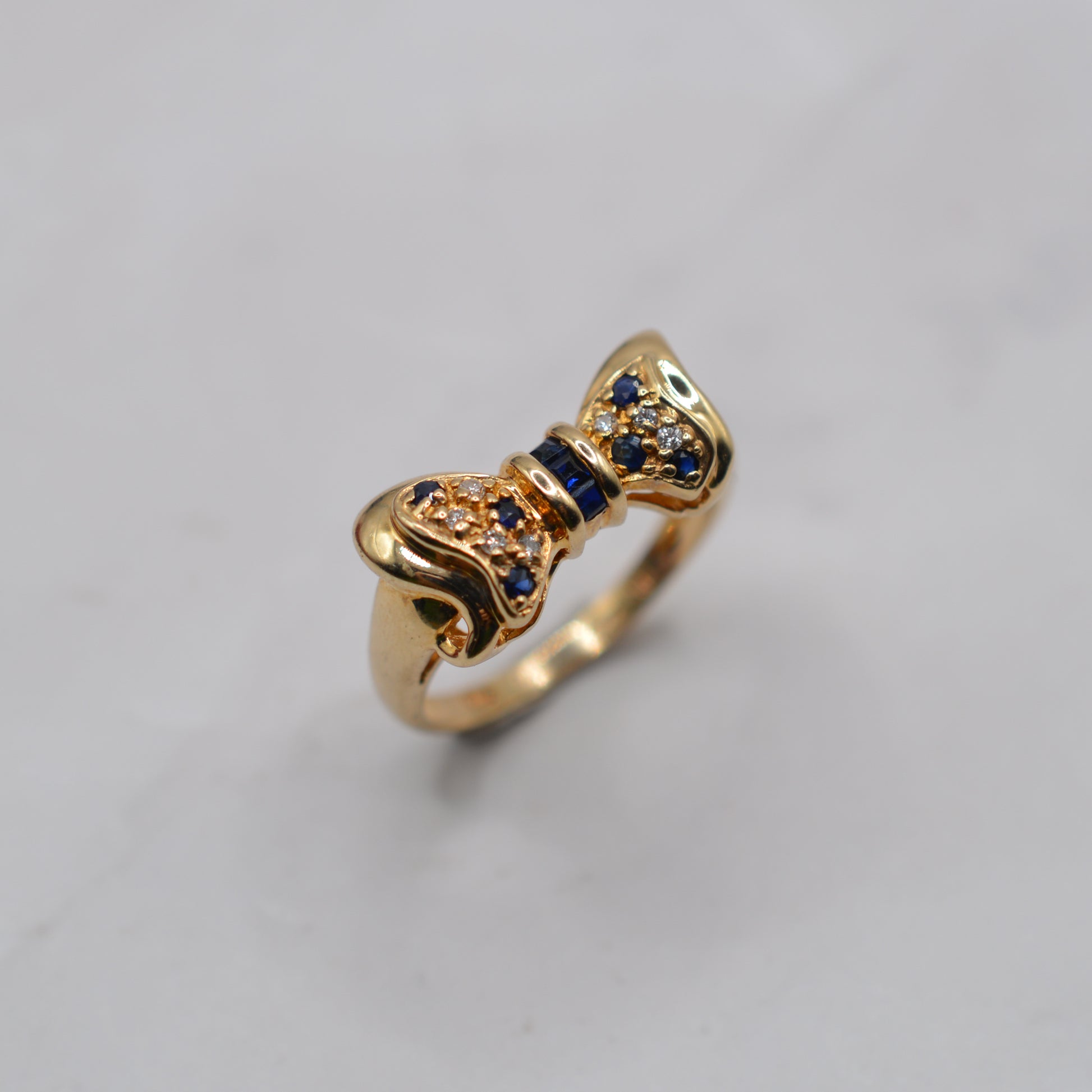 1990s Vintage 9ct Gold Sapphire & Diamond Bow Ring