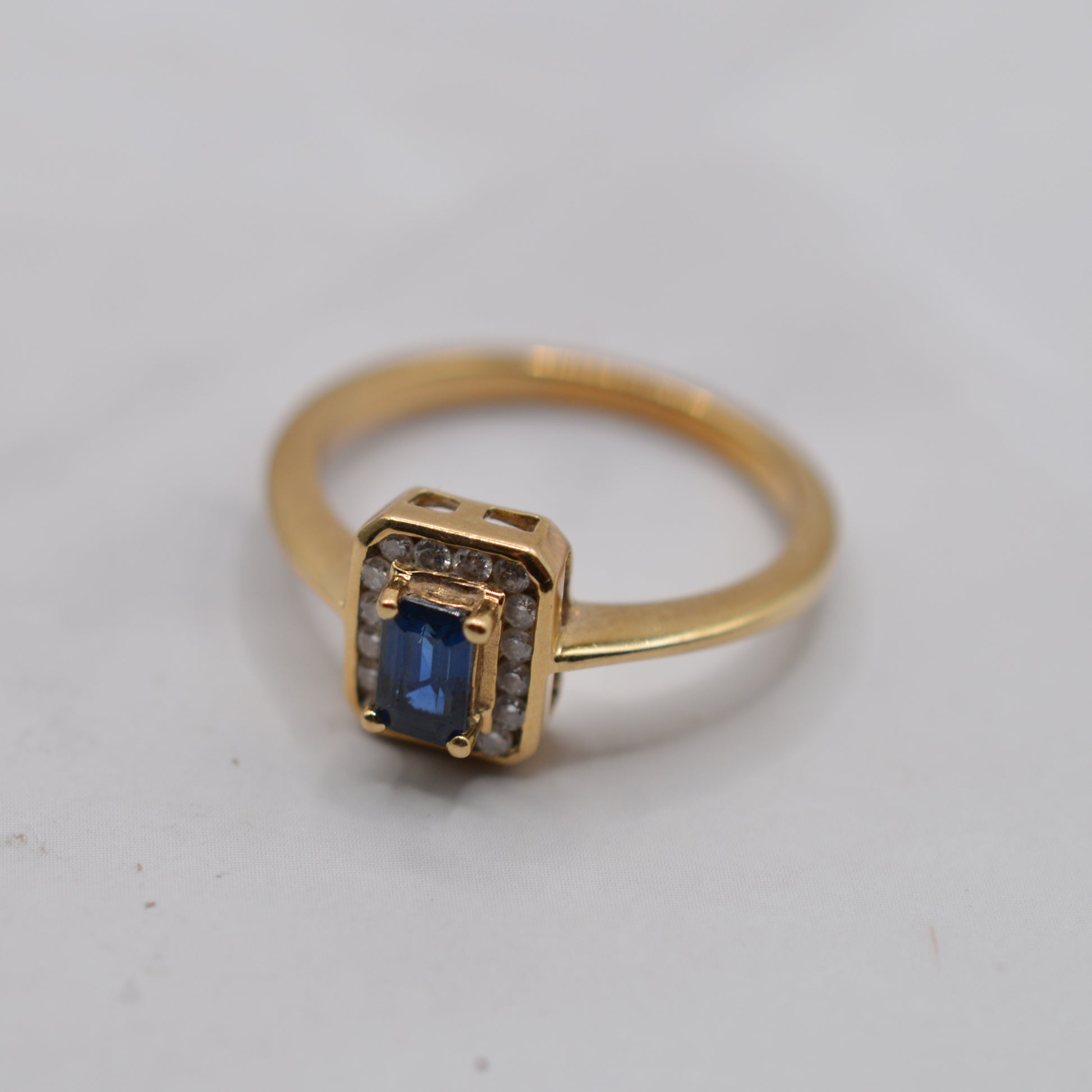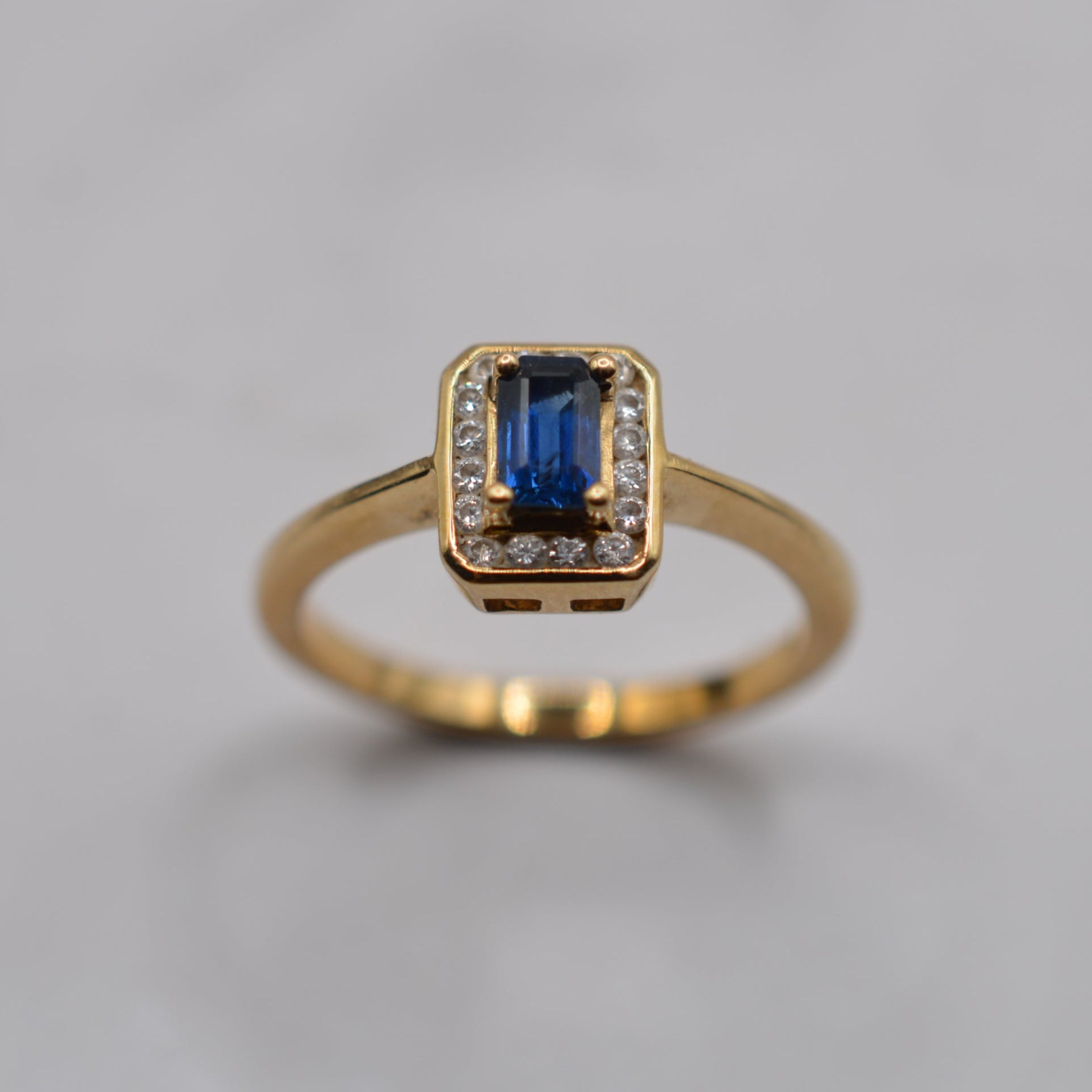 Such a beauuuutiful 9ct gold sapphire and diamond cluster ring! This elegant preloved piece features a rectangular cluster design, with a warm blue emerald-cut sapphire at the centre surrounded by a border of twinkling diamonds. The cluster itself measures approx. 8mm x 6mm, with the sapphire showing a lovely deep shade of blue with a few natural inclusions, while the diamonds add a sparkling frame. A truly gorgeous piece crafted in shiny buttery yellow gold that is in excellent condition and is sure to get compliments.