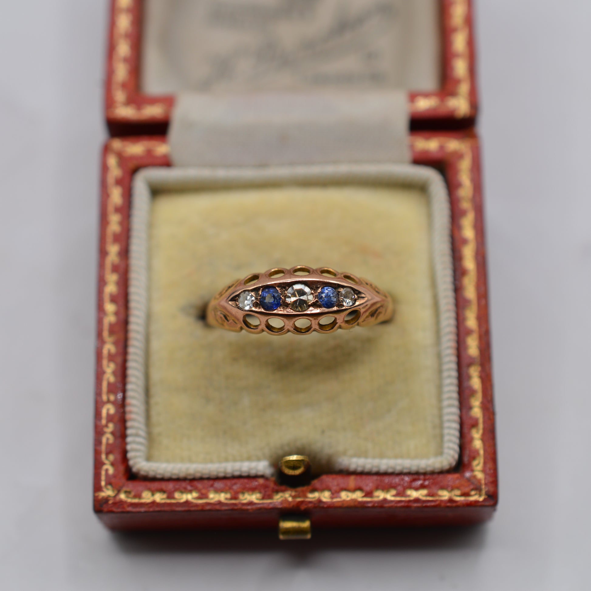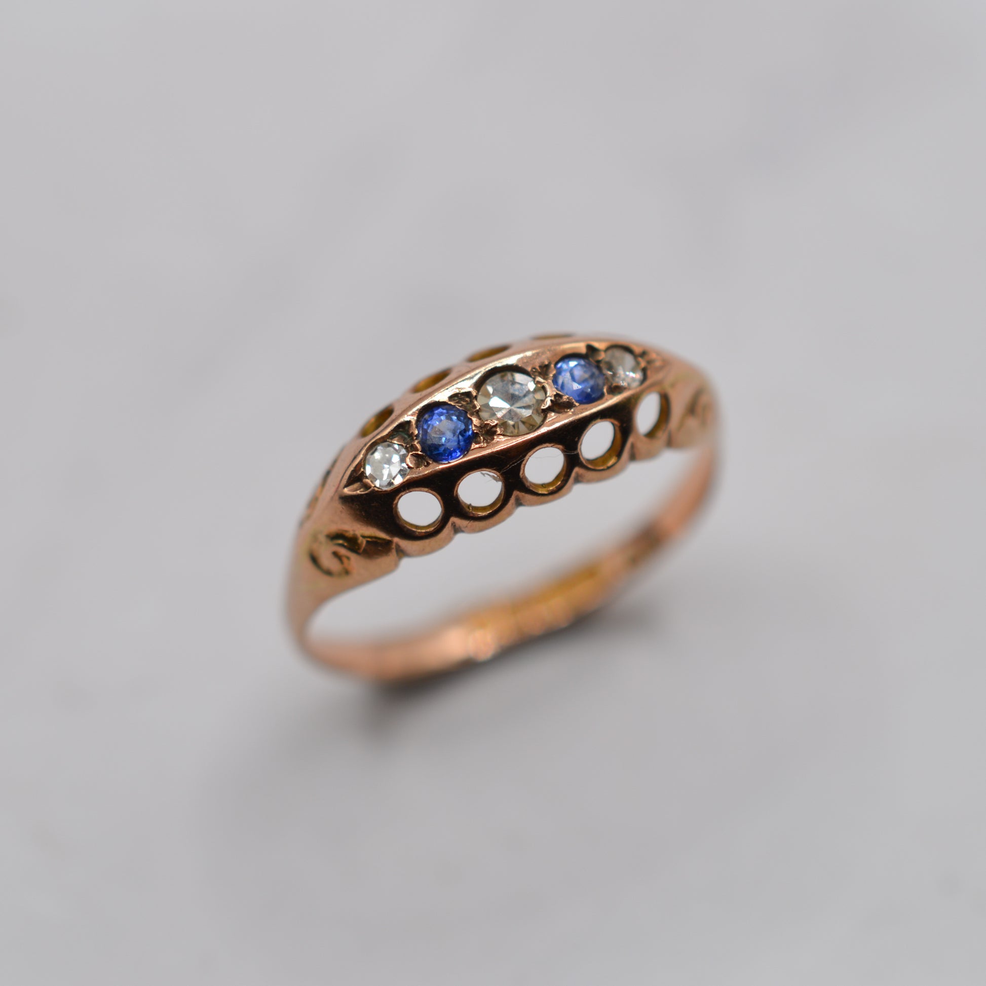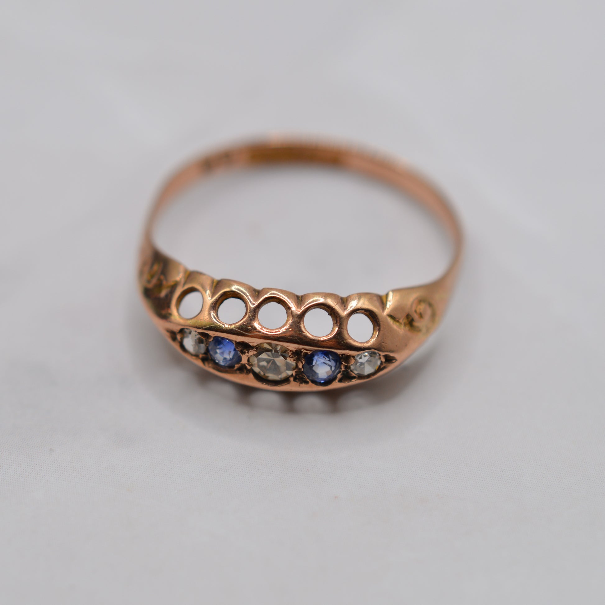 A beautiful antique 9ct rose gold sapphire and diamond boat ring from 1919. This elegant piece features five alternating gemstones -- sapphires in a warm blue with classic rose-cut diamonds -- all set in a traditional boat-shaped head with a pierced gallery, typical of Edwardian and early George V jewellery. A wonderful example of early 20th century jewellery, perfect for collectors and antique jewellery lovers alike.
