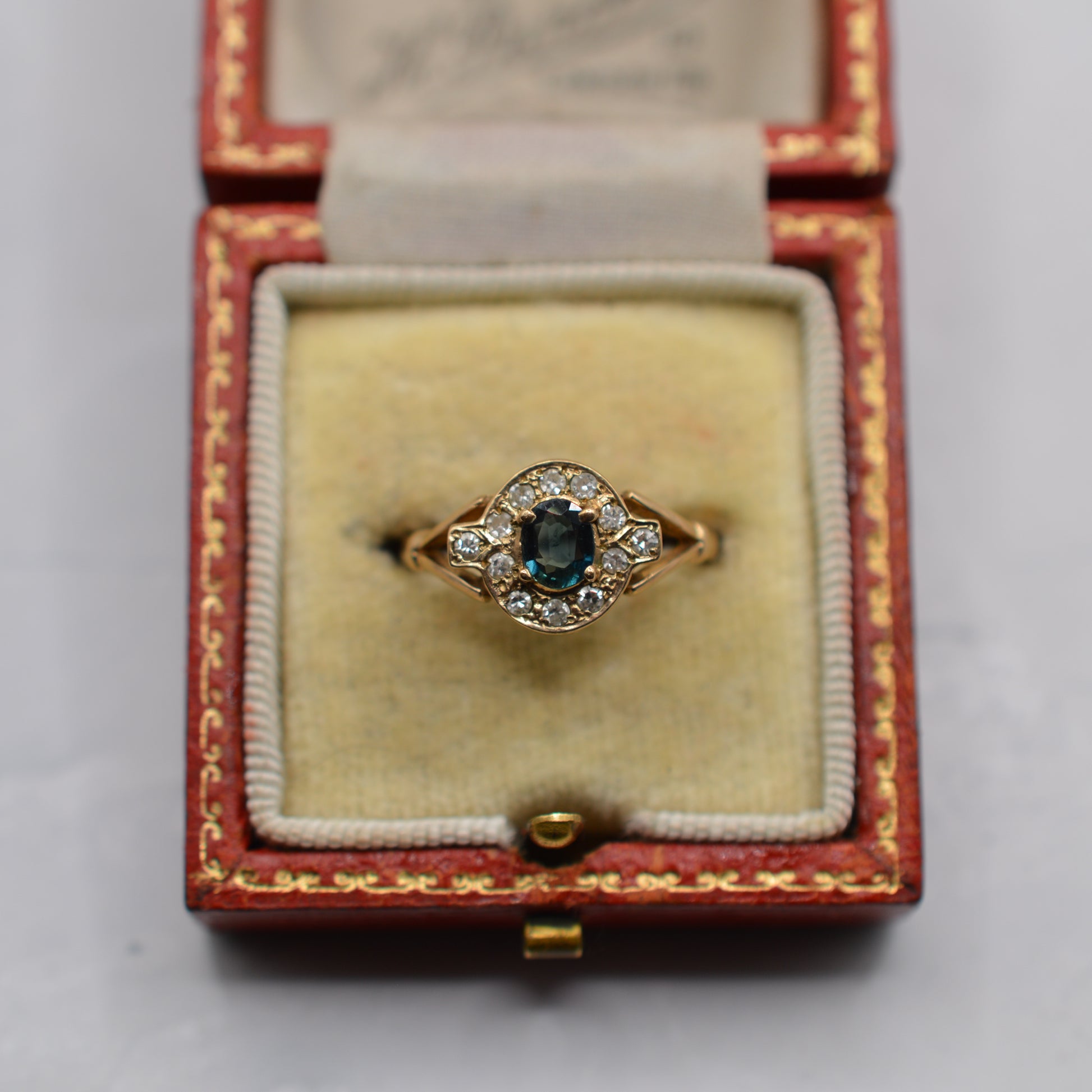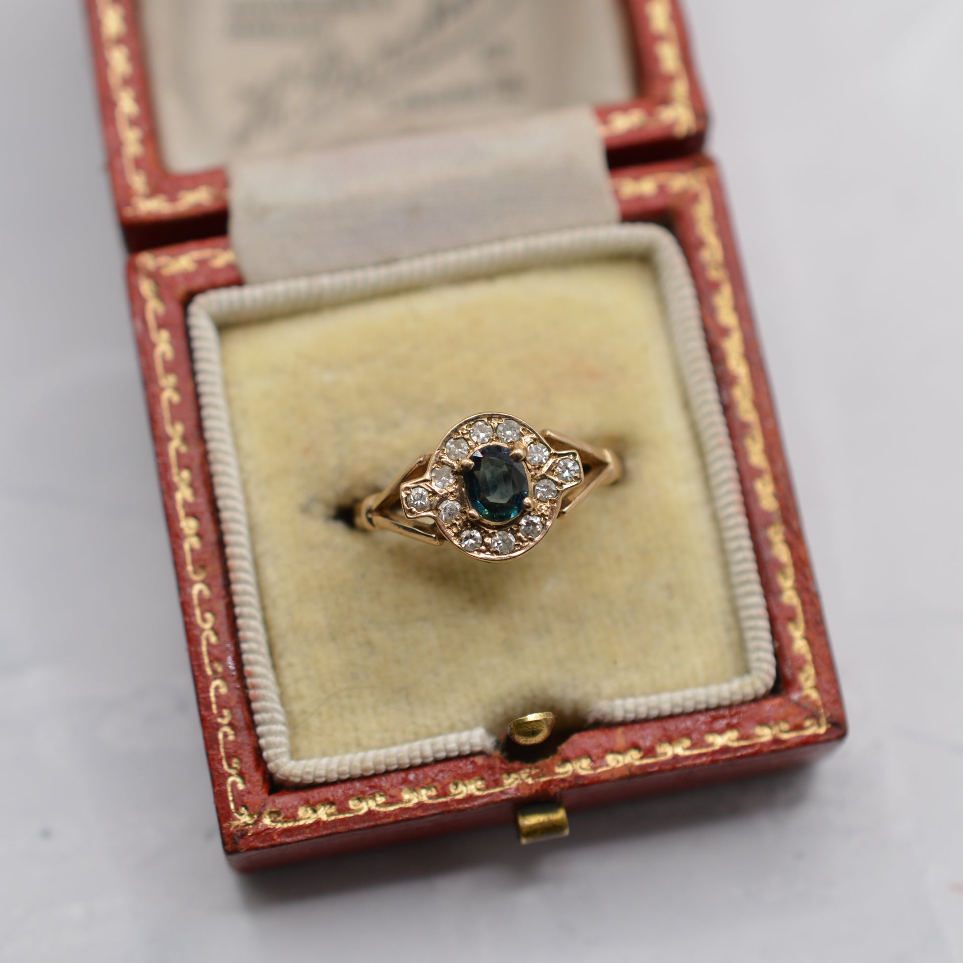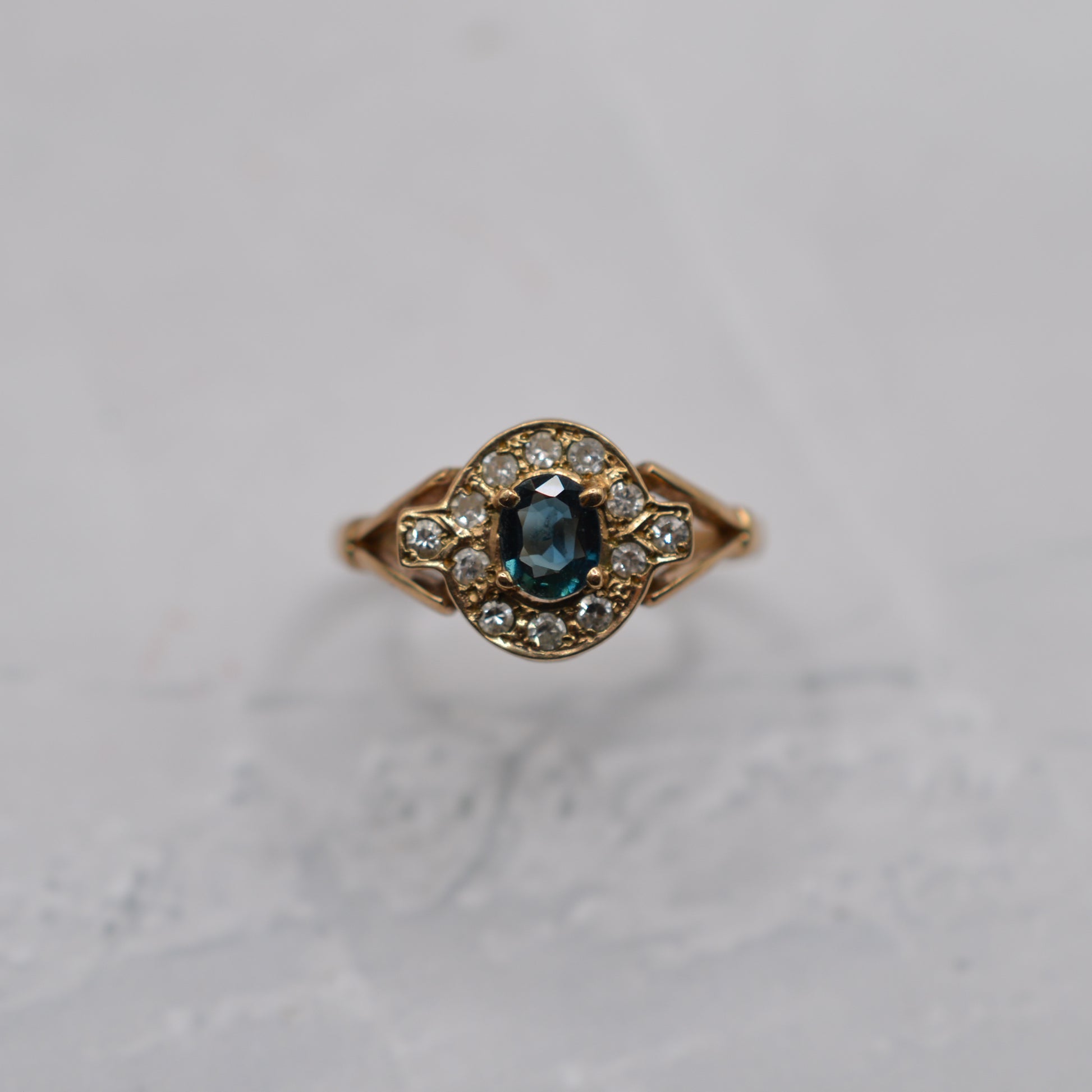A truly beautiful and rather unusual 1970s cluster ring! This fabulous 9ct yellow gold ring features an oval sapphire in a striking teal green-blue shade, framed by a sparkling halo of diamonds. The cluster is also flanked by an additional diamond on each shoulder, leading into elegant split shoulders to add gorgeous symmetry. A very Art-Deco inspired piece for all occasions!