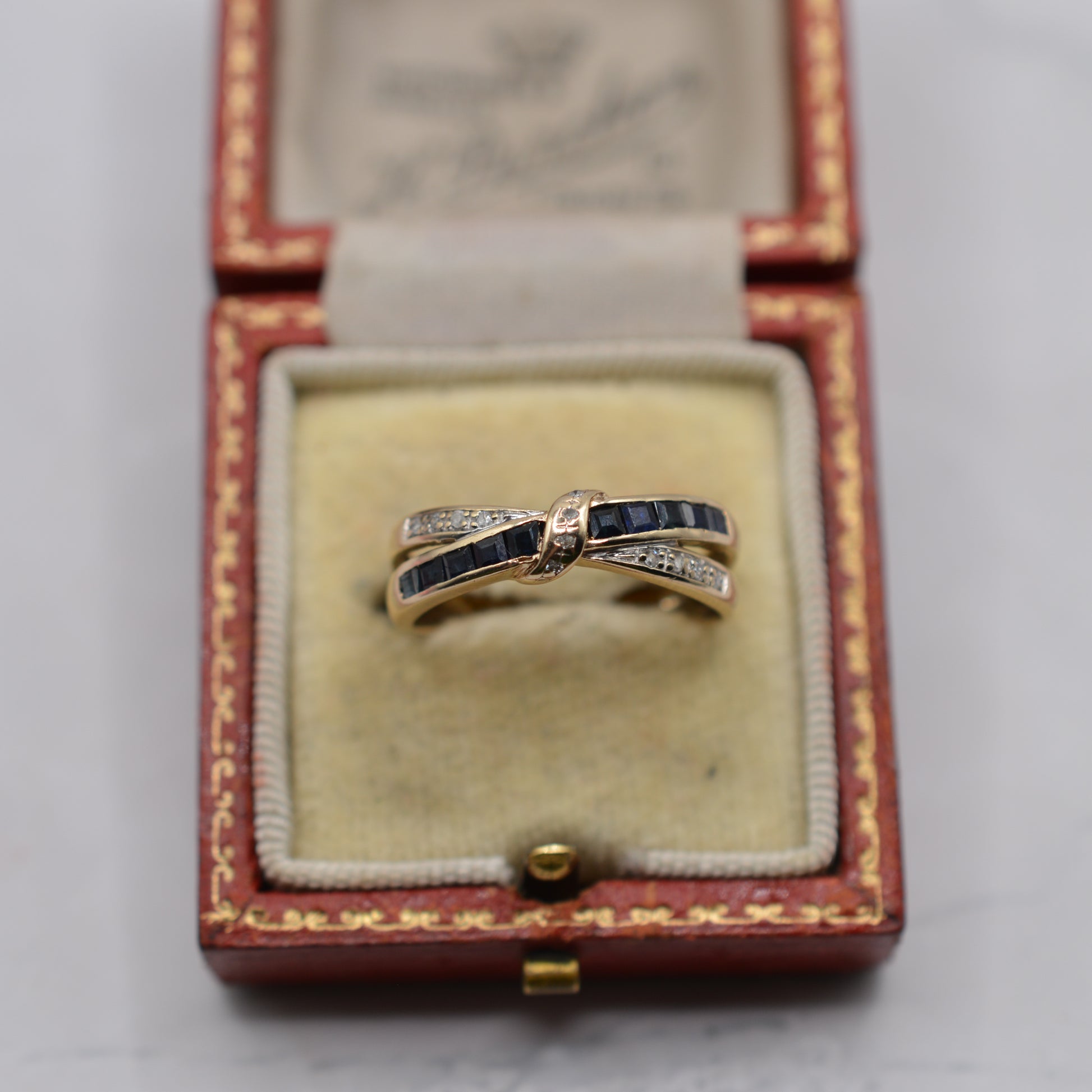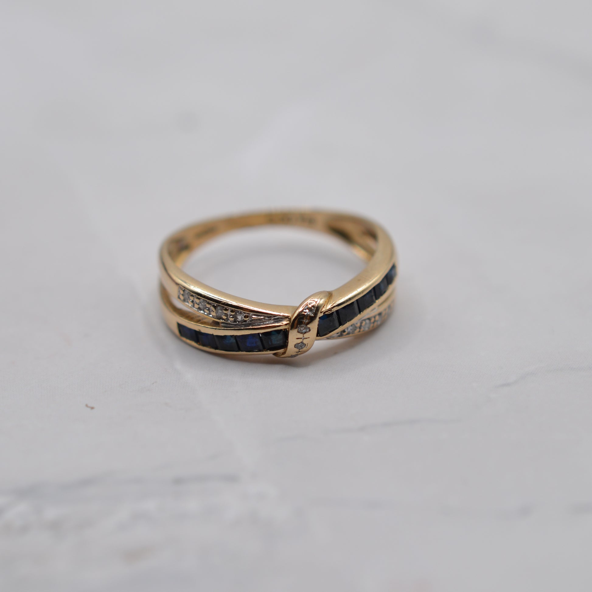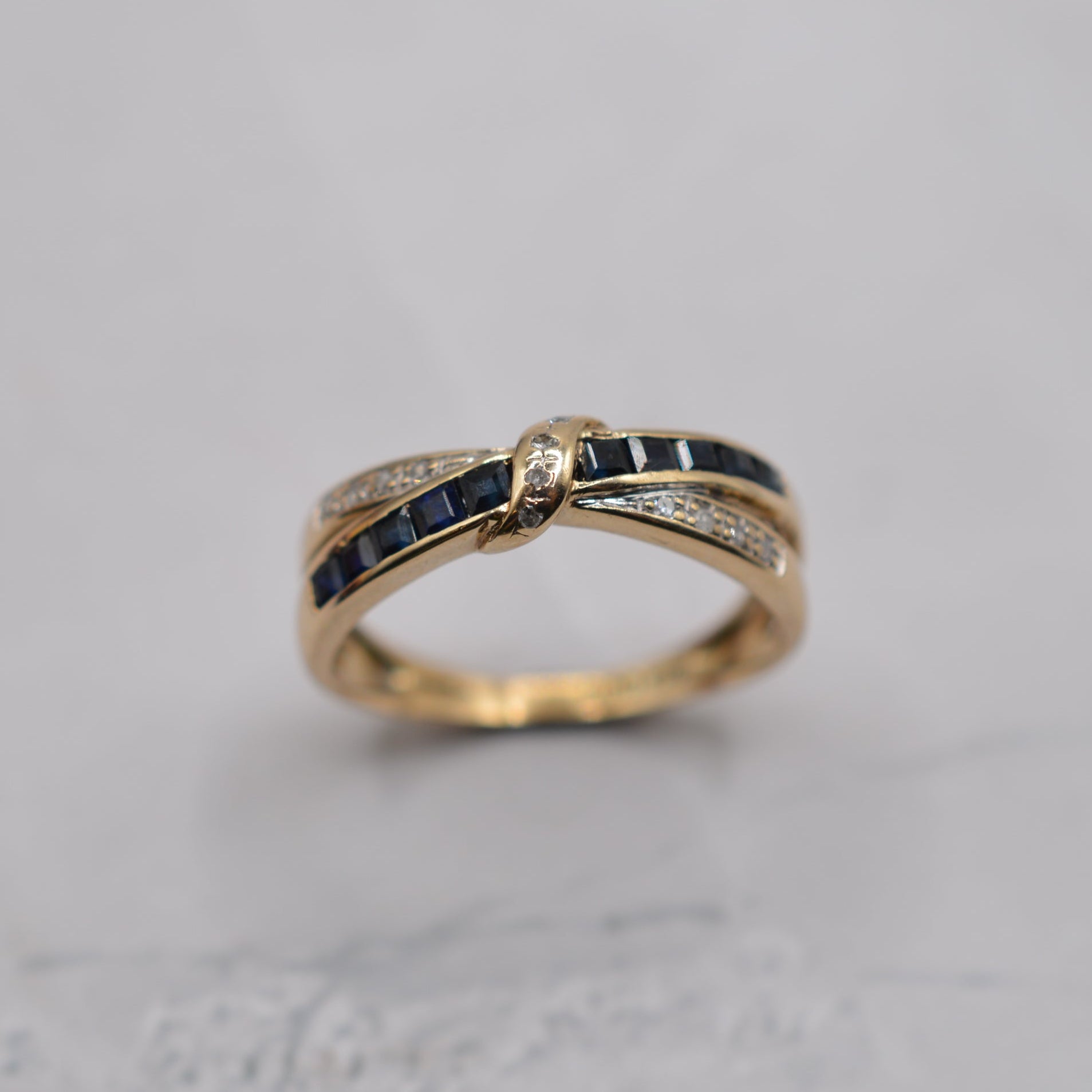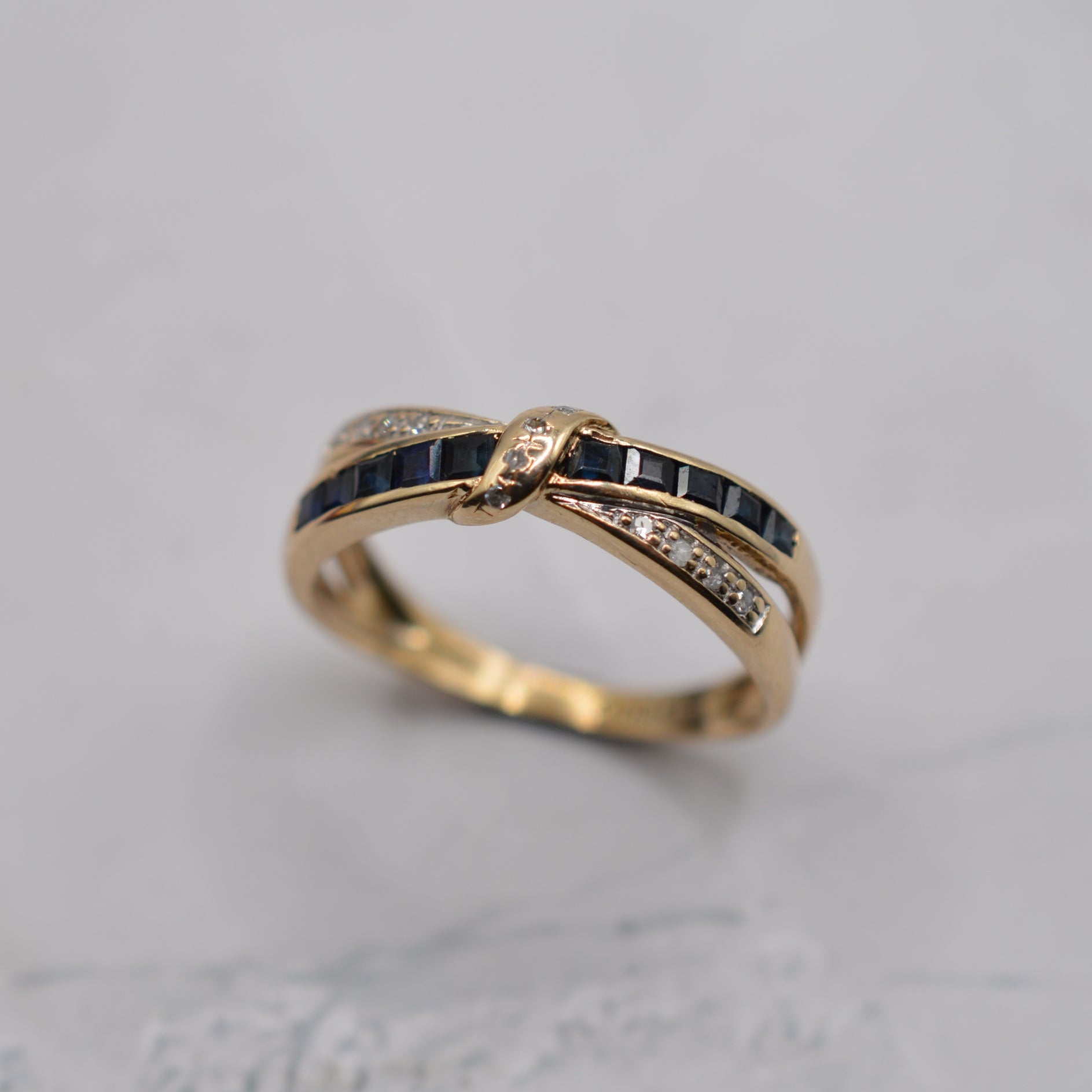A rather pretty 9ct gold sapphire and diamond crossover ring. The design features two overlapping bands: one channel-set with navy blue square-cut sapphires; the other adorned with little sparkling diamond chips. The bands meet together in the centre, where a gold twist set with further diamond chips ties the two together in a bow motif. Utterly adorable!