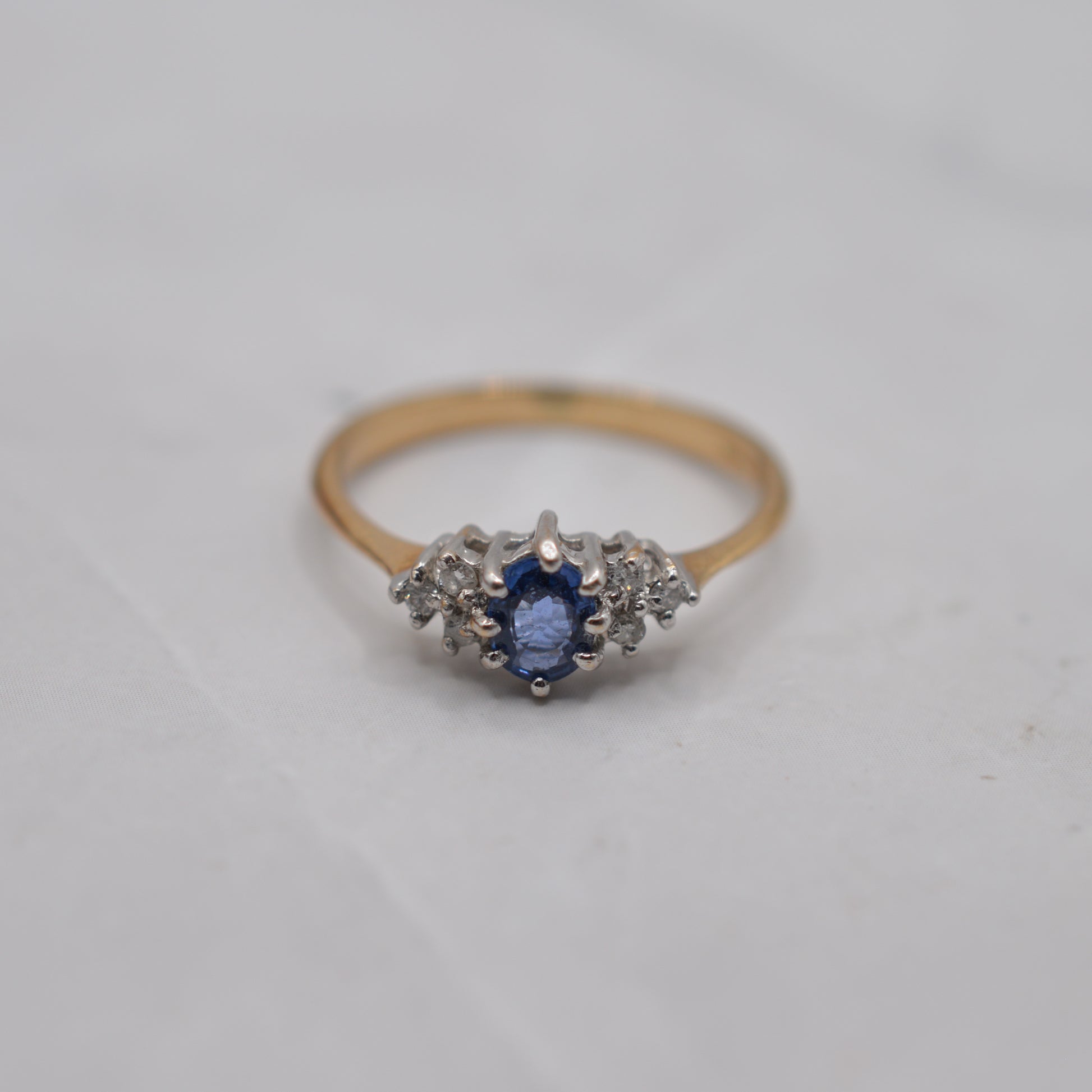 A delightful 9ct gold sapphire and diamond ring from the 1990s. This elegant features a beautiful oval-cut sapphire at the centre, displaying a truly gorgeous shade of cornflower blue with excellent clarity and transparency. The sapphire is flanked by three small, sparkly diamonds on each side, forming a symmetrical design with lovely sparkle. This is such a lovely choice for sapphire lovers and work beautifully either as an everyday ring or for special occasions.