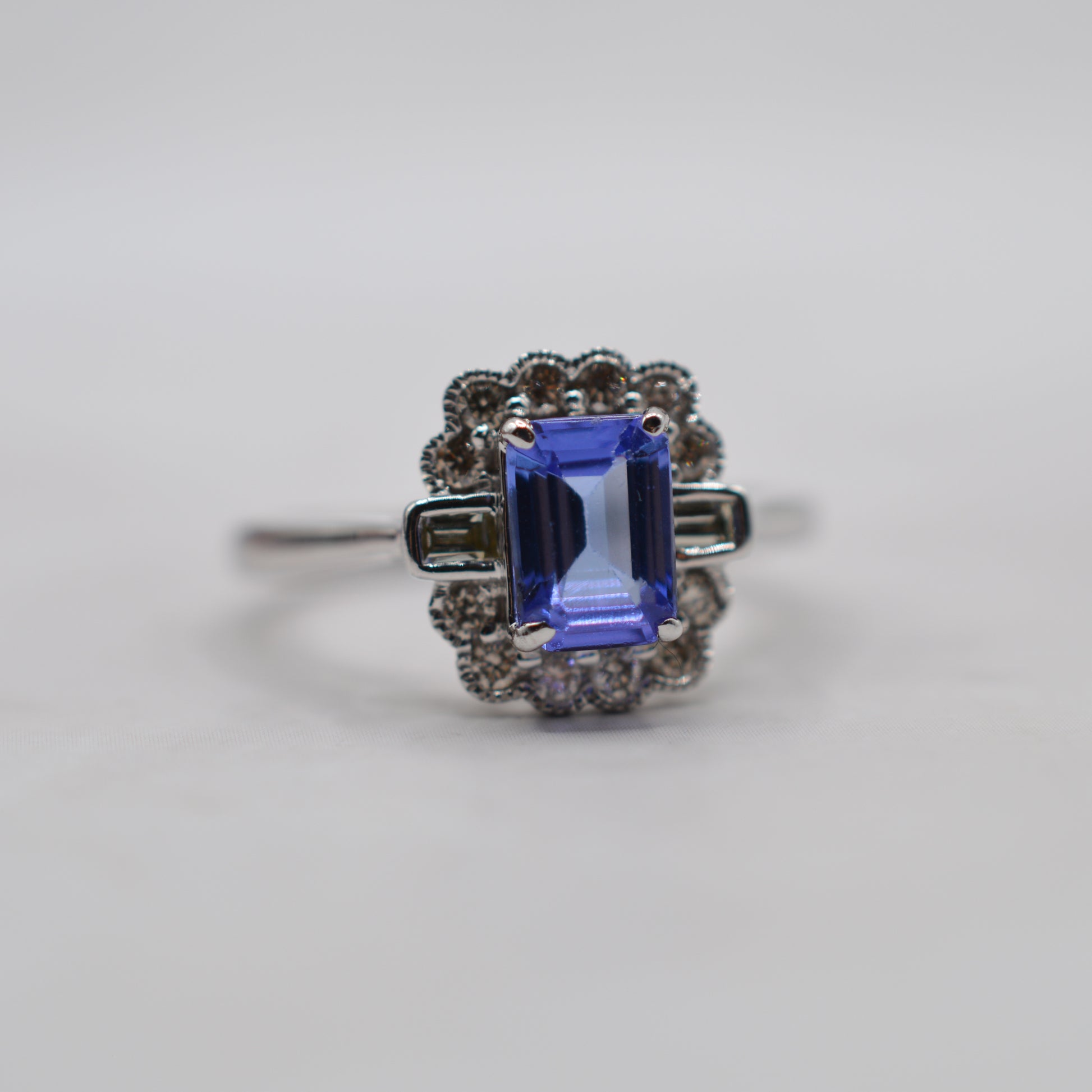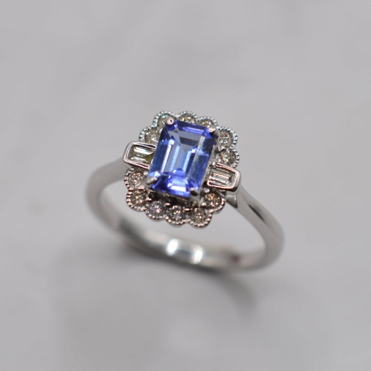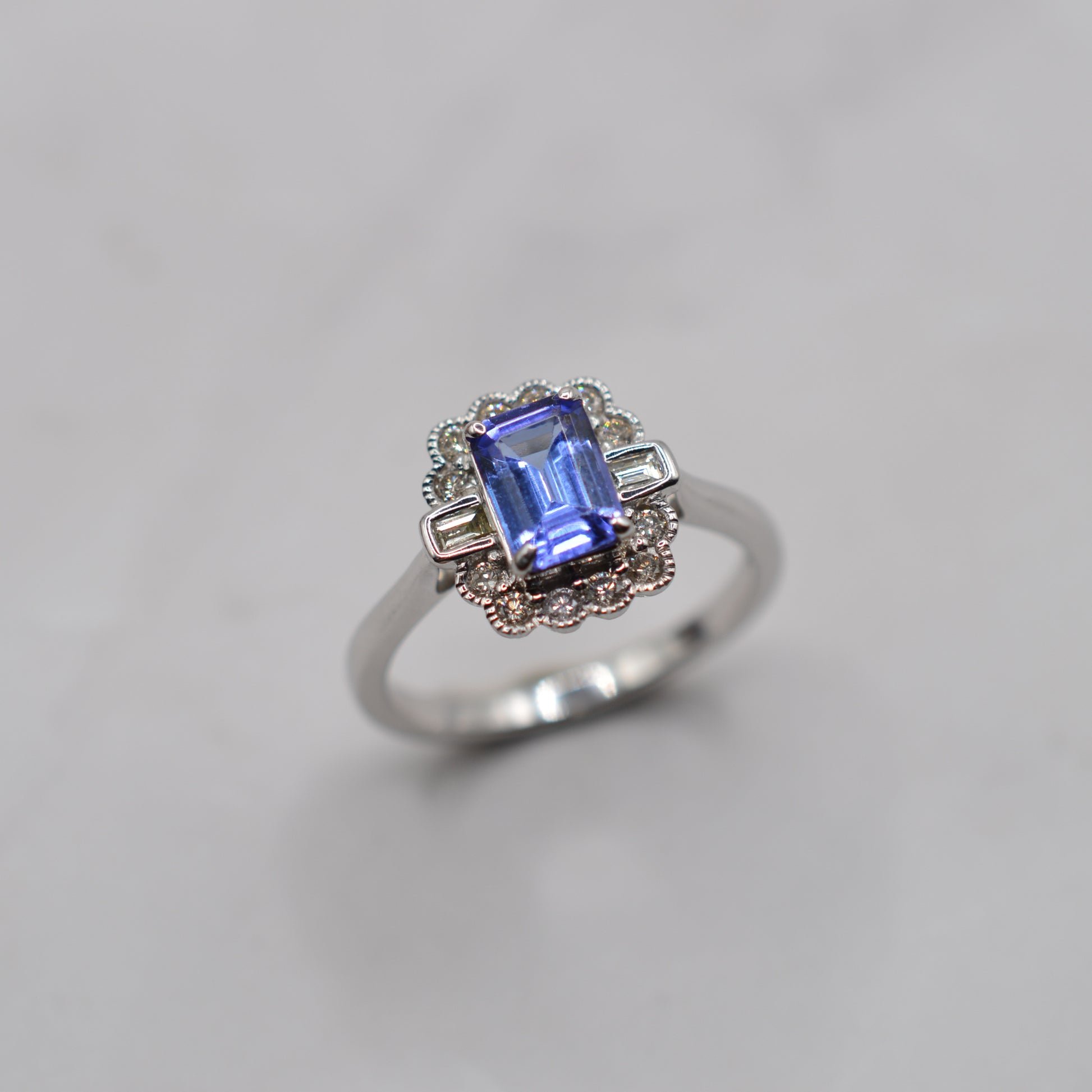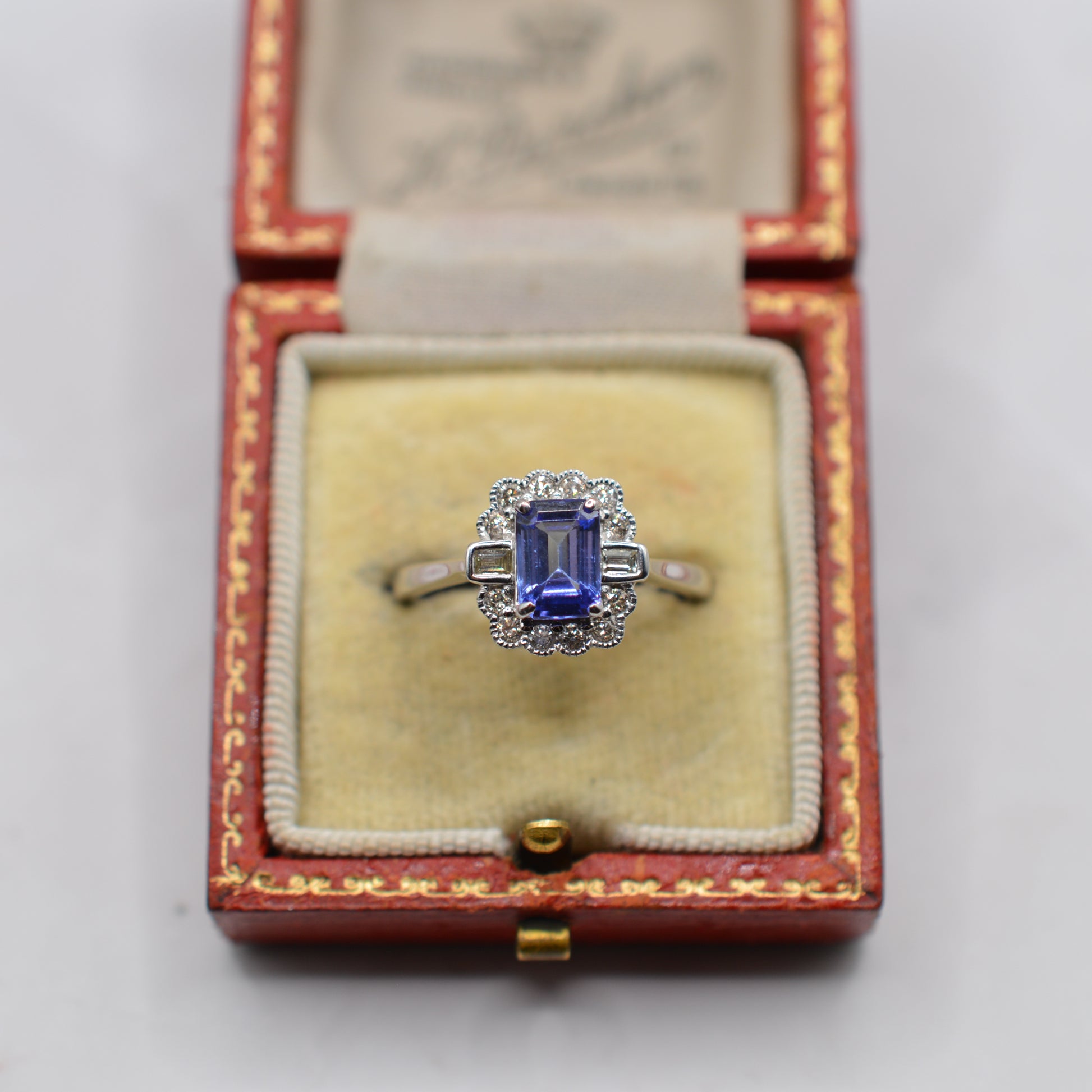 An utterly stunning 9ct white gold tanzanite and diamond halo cluster ring in fabulous Art Deco style. This gorgeous piece features a rectangular emerald-cut tanzanite in a rich shade of purple-blue, surrounded by a sparkling halo of diamonds. Two baguette-cut diamonds are set horizontally at either side of the tanzanite, with the rest of the border formed from round brilliant-cut diamonds, creating a bold geometric look (very 1920s!). A timeless design that is elegant, eye-catching and absolutely dazzling!