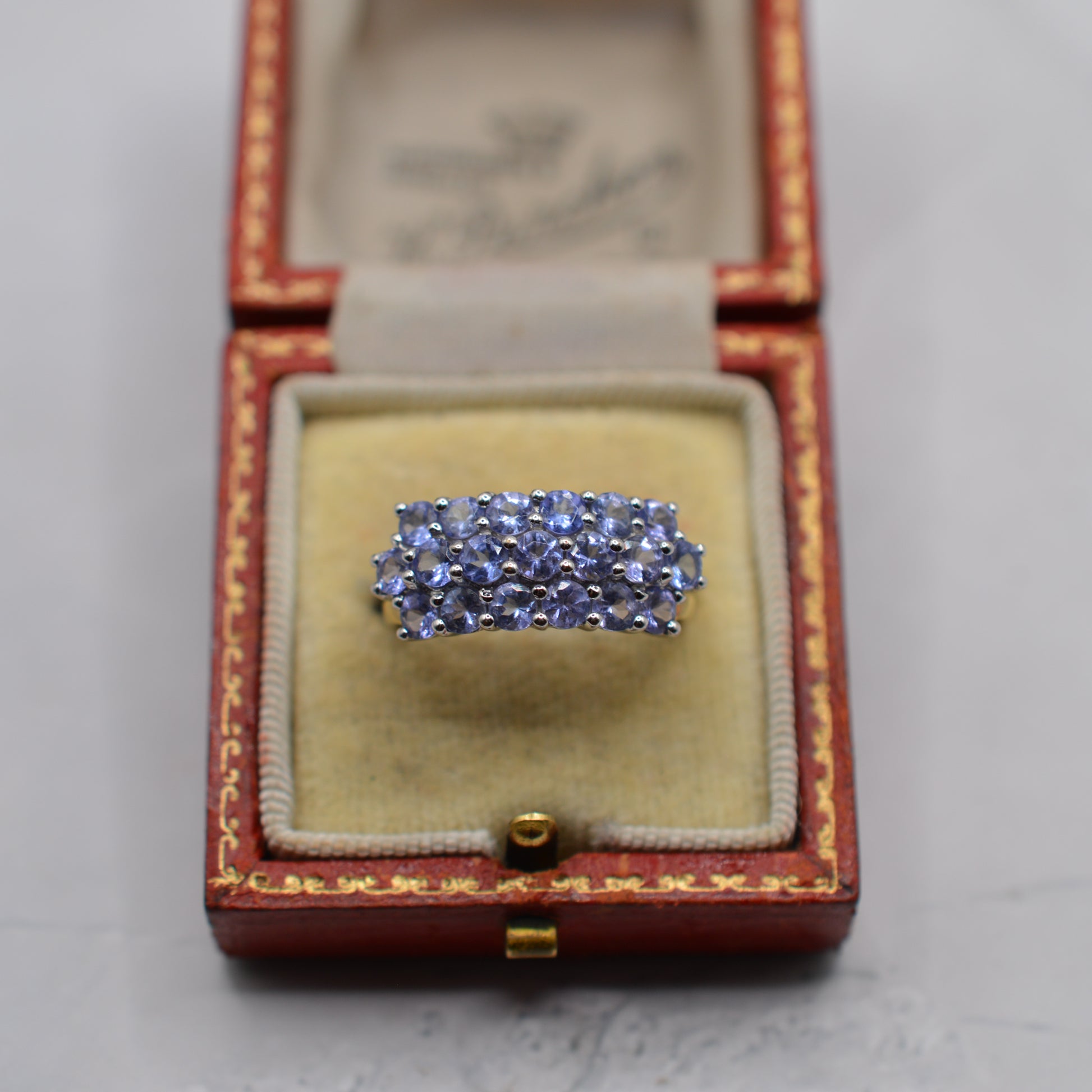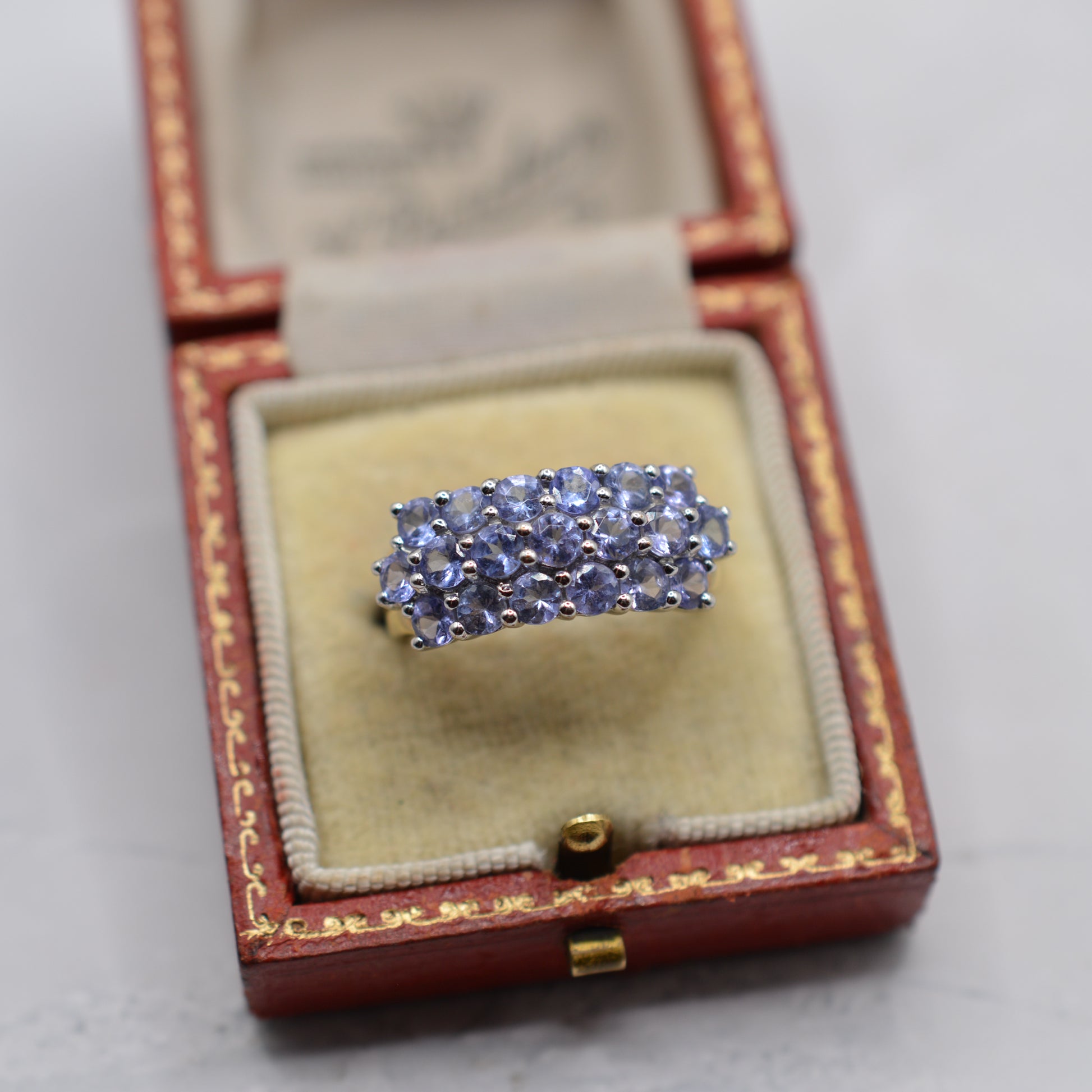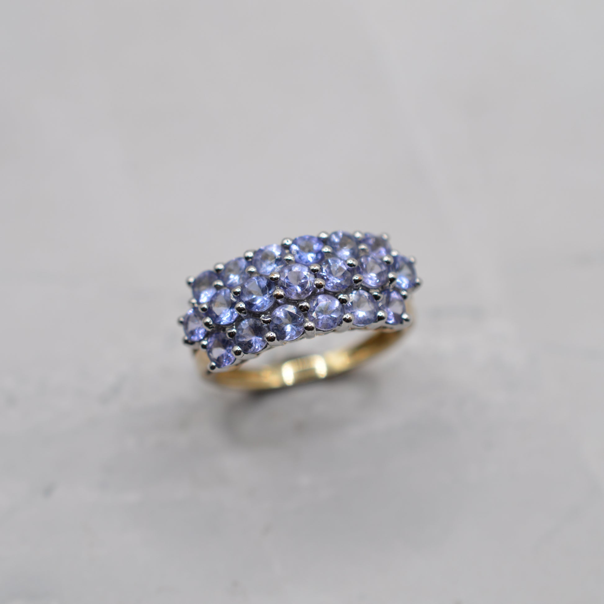 An utterly goooorgeous chunky Y2K tanzanite cluster ring! This beautiful 9ct gold piece features three sparkling rows of lilac-blue round-cut tanzanites (19 stones in total), all beautifully matched in colour and full of dreamy sparkle. A perfect choice for lovers of the rare Tanzanite gemstone or a wonderful December birthstone treat.