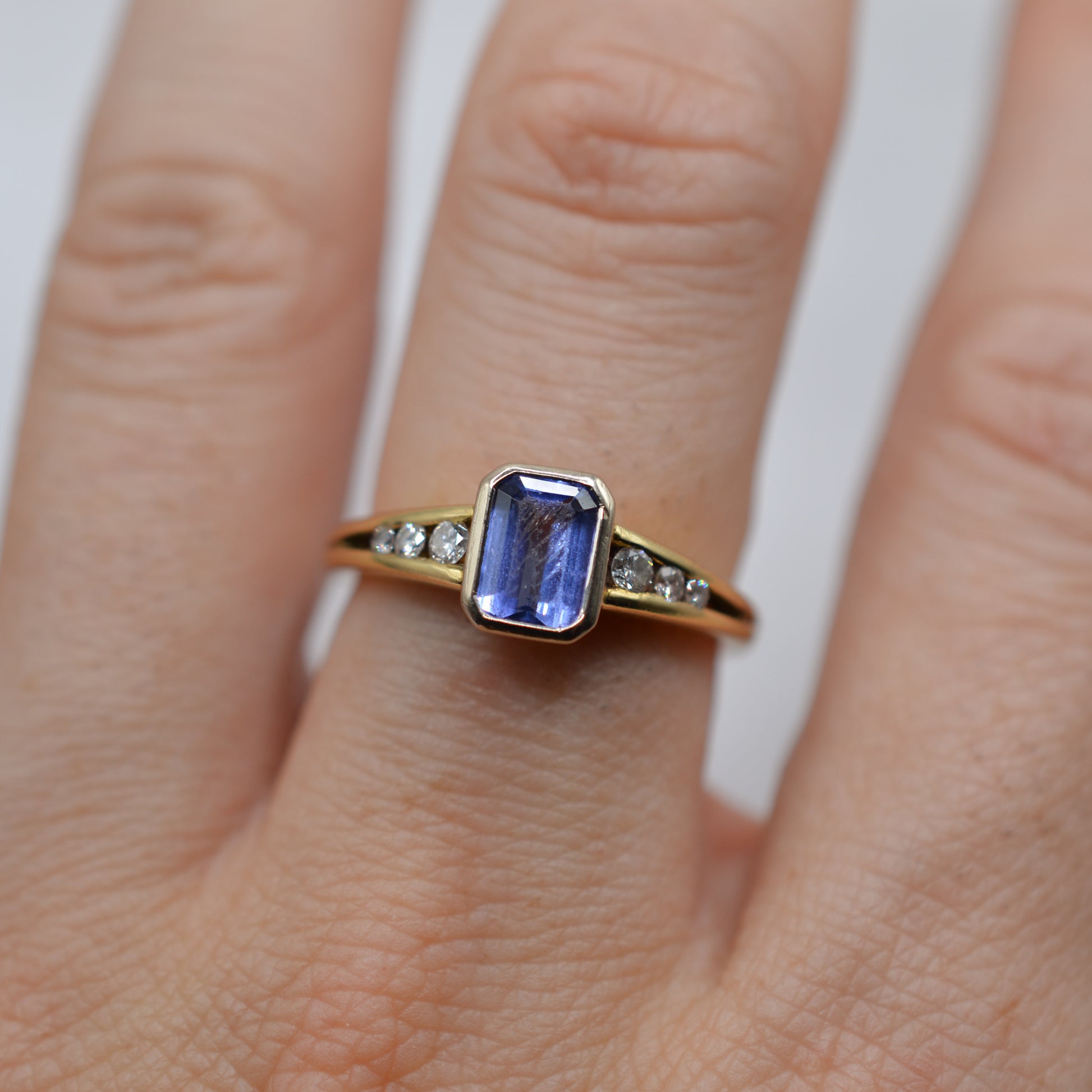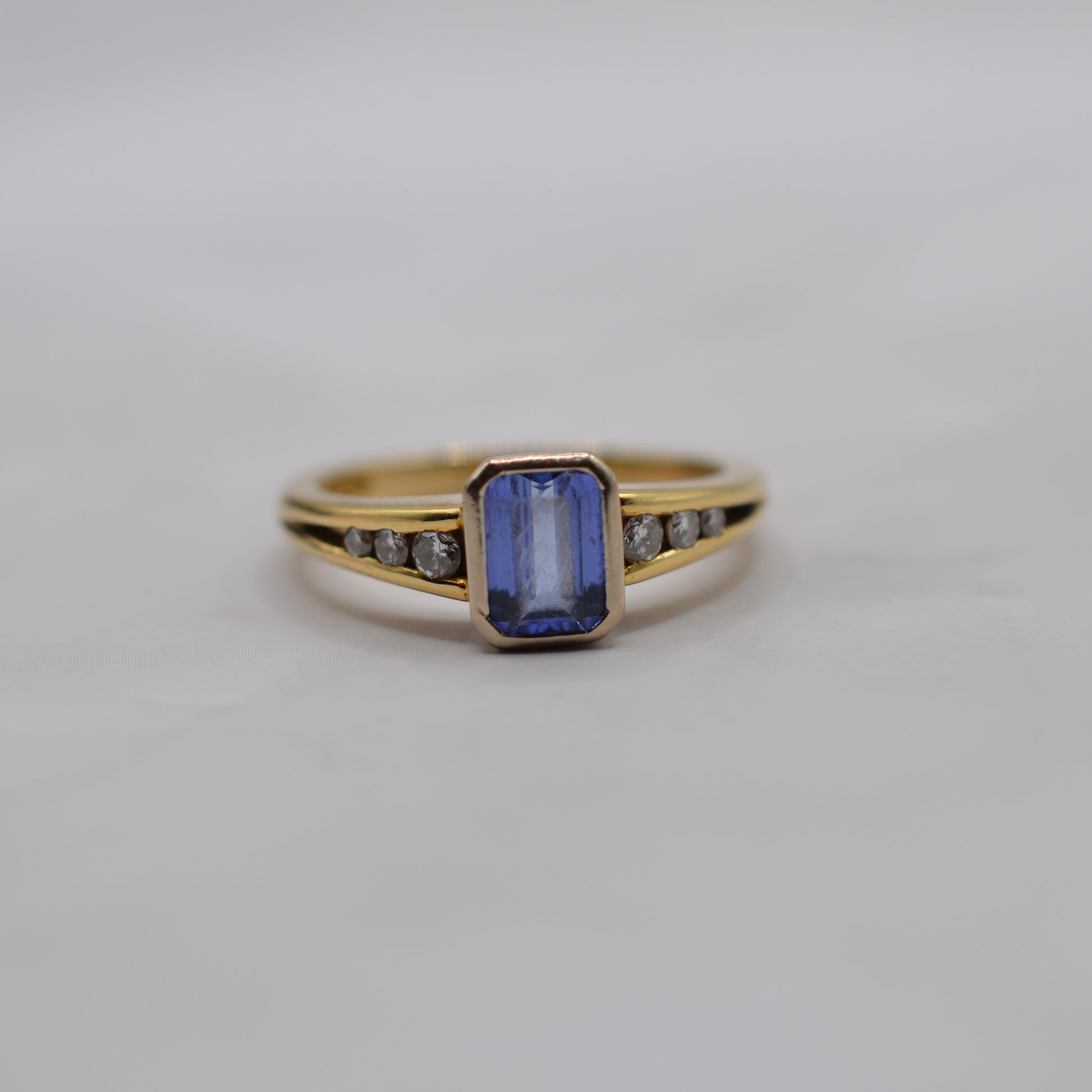 A luxurious Y2K-era 18ct gold ring set with tanzanite and diamonds. The centre features a bezel-set tanzanite in a dusky shade of blue, flanked by three round diamonds channel-set into each shoulder for a little sparkle. A heavyweight high carat gold piece to brighten up any outfit!