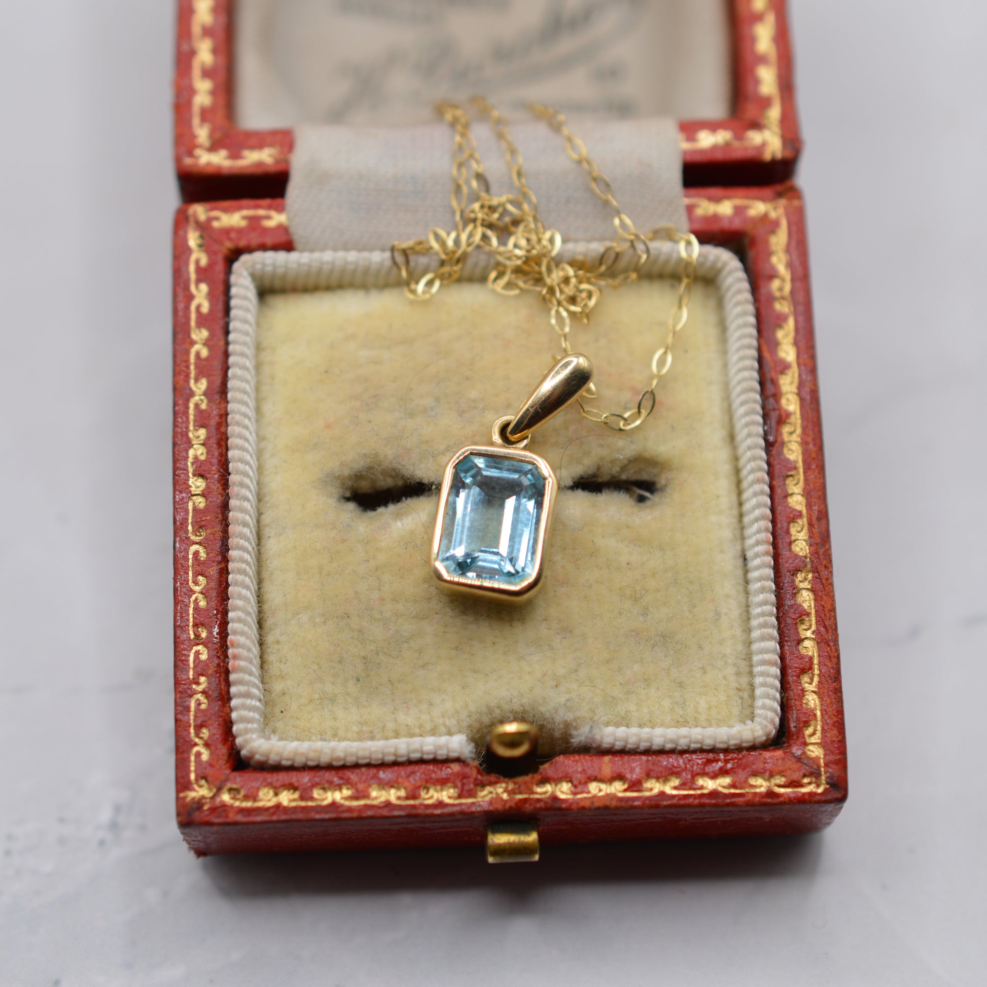 A very pretty 9ct gold blue topaz pendant necklace. This elegant piece features an emerald-cut blue topaz in a soft pale blue (similar to aquamarine), bezel set in a polished yellow gold frame. The pendant, measuring approx. 9mm x 7mm, is suspended from an 18" 9ct gold trace-link chain, together forming a lovely piece that works beautifully alone or layered with others.