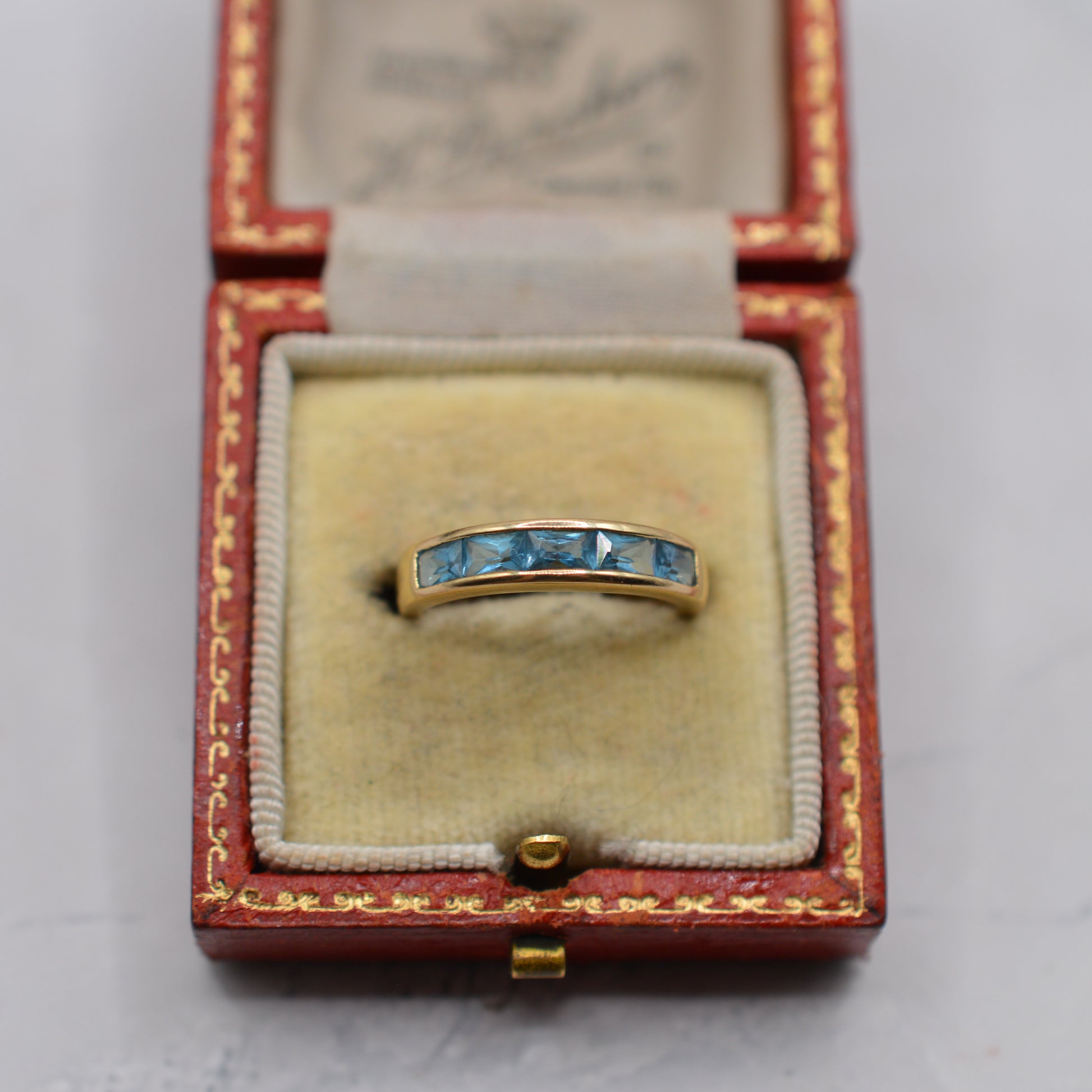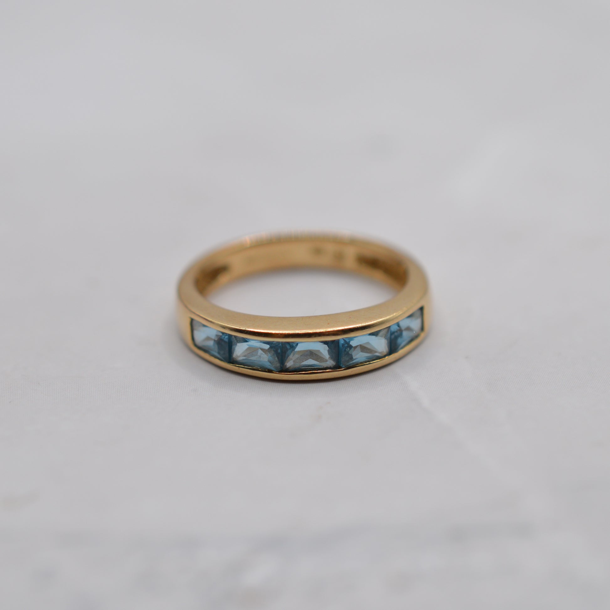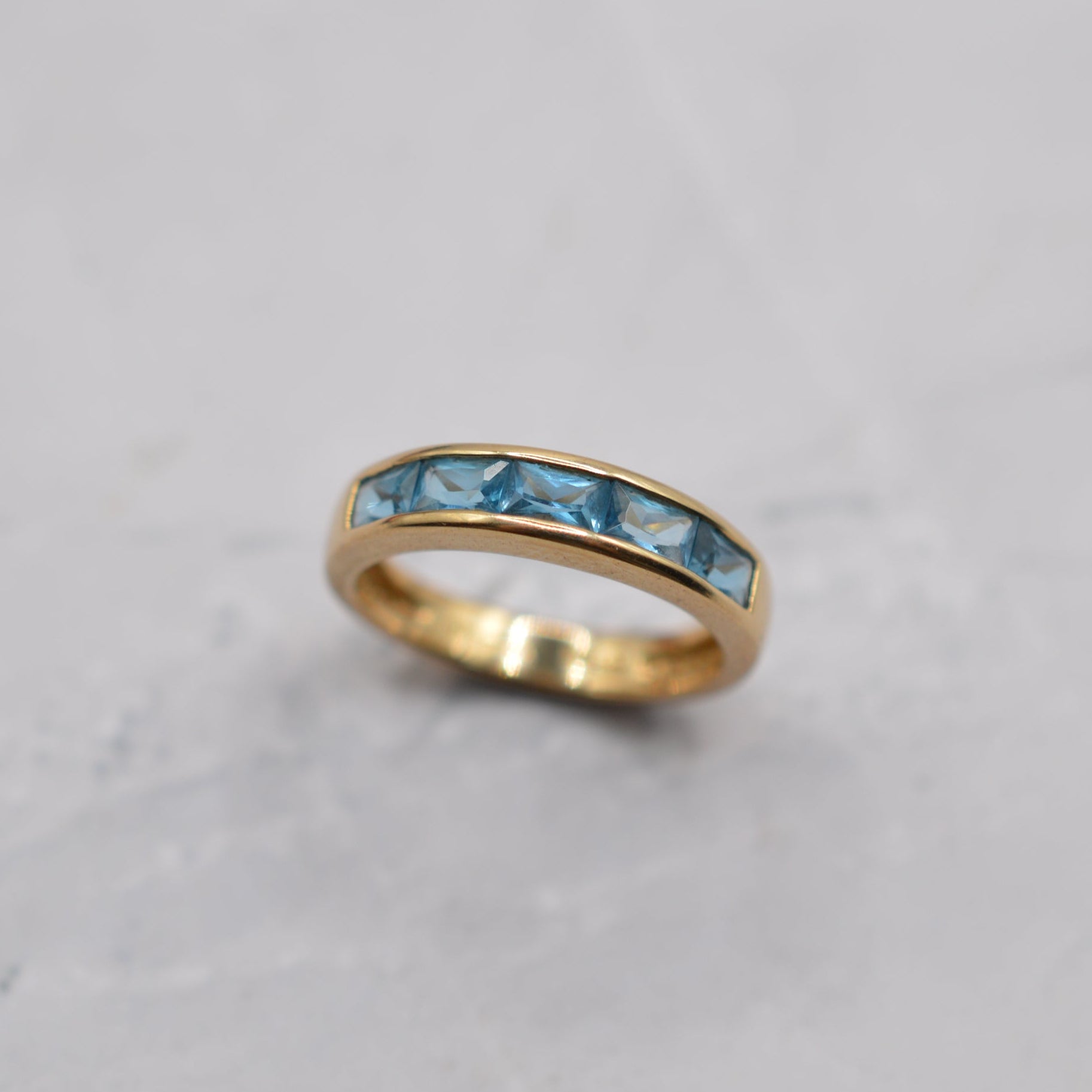 A delightful Y2K-era 9ct gold blue topaz half-eternity ring. This beautiful piece features a row of rectangular channel-set blue topaz gemstones, all beautifully matched in a bright shade of sea-blue. This makes a wonderful standalone ring, but also stacks well alongside other favourites!