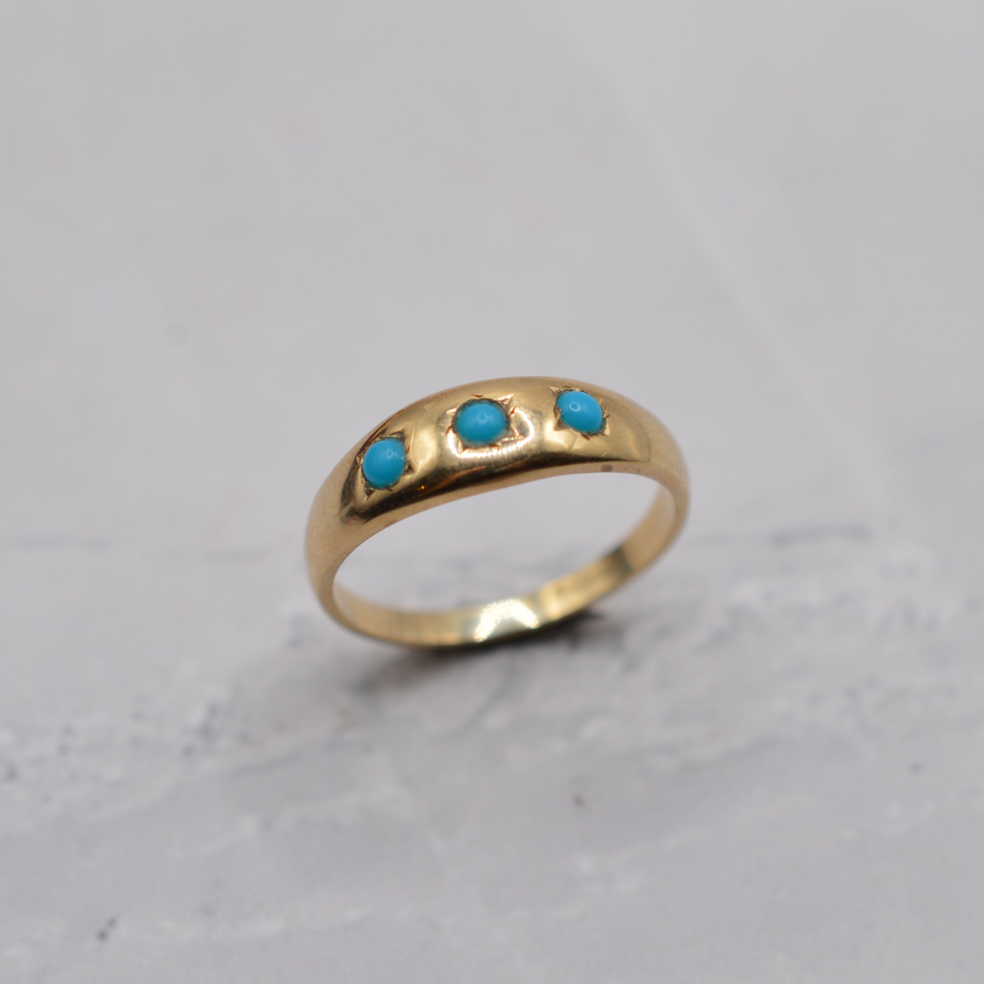 Such an adorable little 9ct gold turquoise gypsy ring! This lovely piece features three bright blue turquoise stones, each star-set into a smooth, polished yellow gold. This is such a classic gypsy ring that offers a bit of bohemian-meets-Victorian charm, perfect for everyday wear or stacking with other favourites.