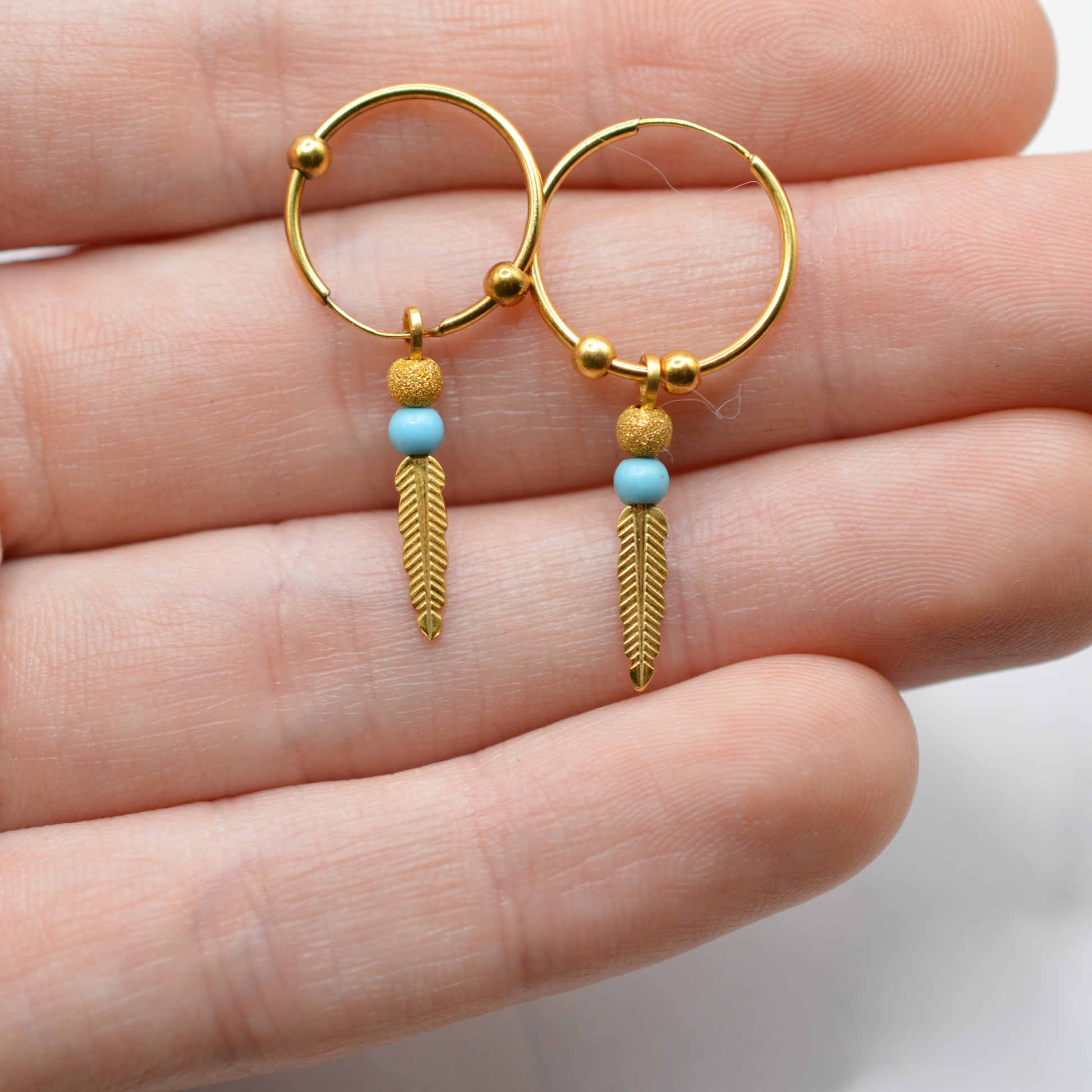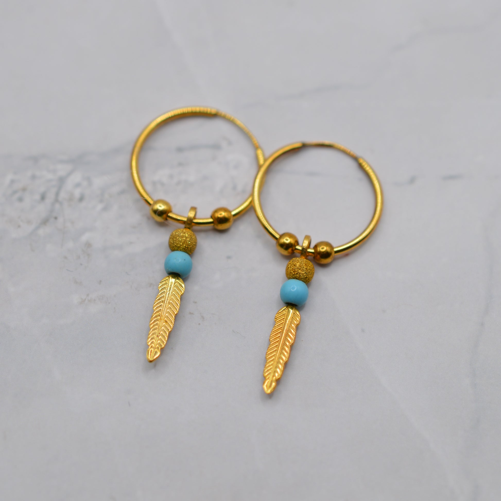 9ct Gold Feather & Turquoise Bracelet & Hoop Earrings Set