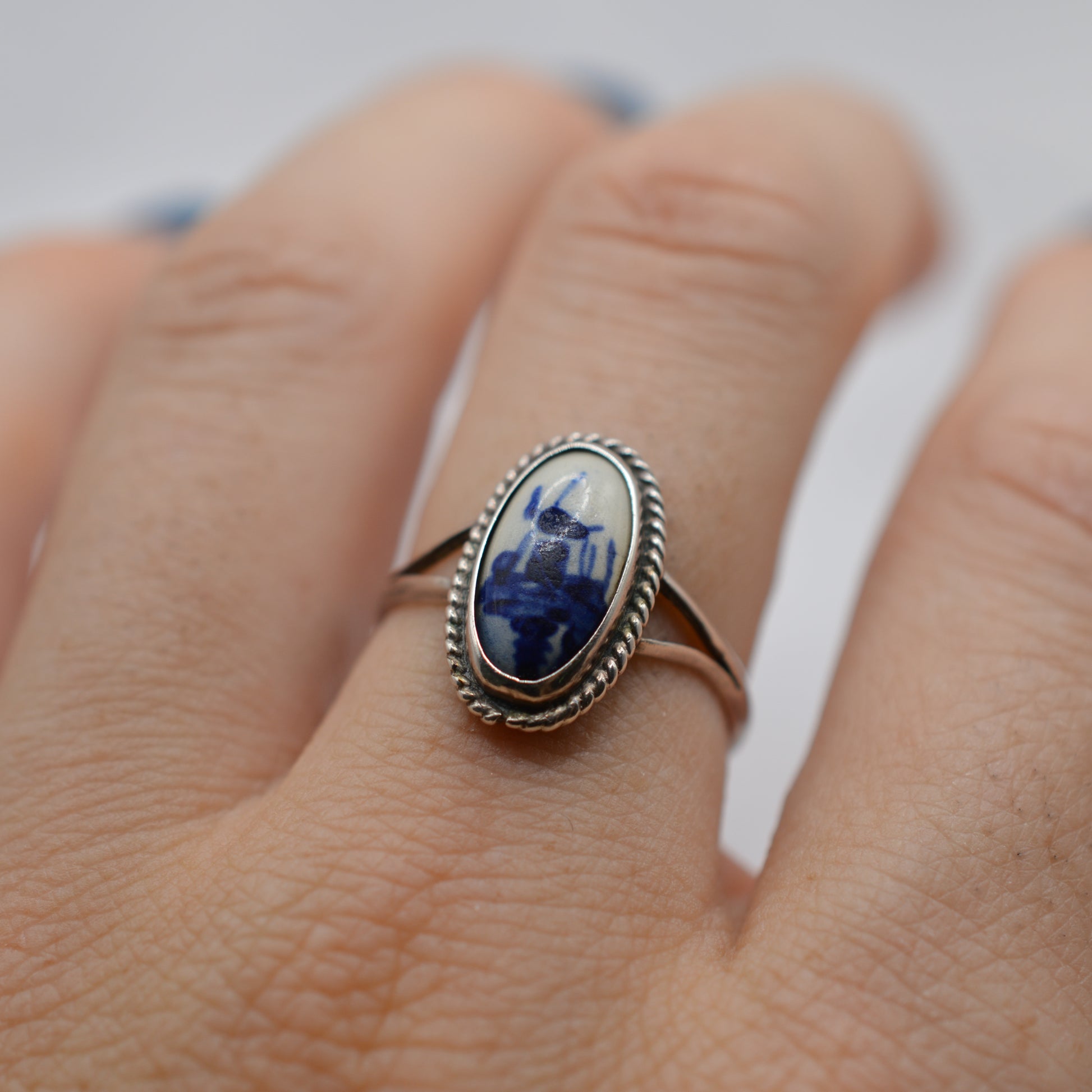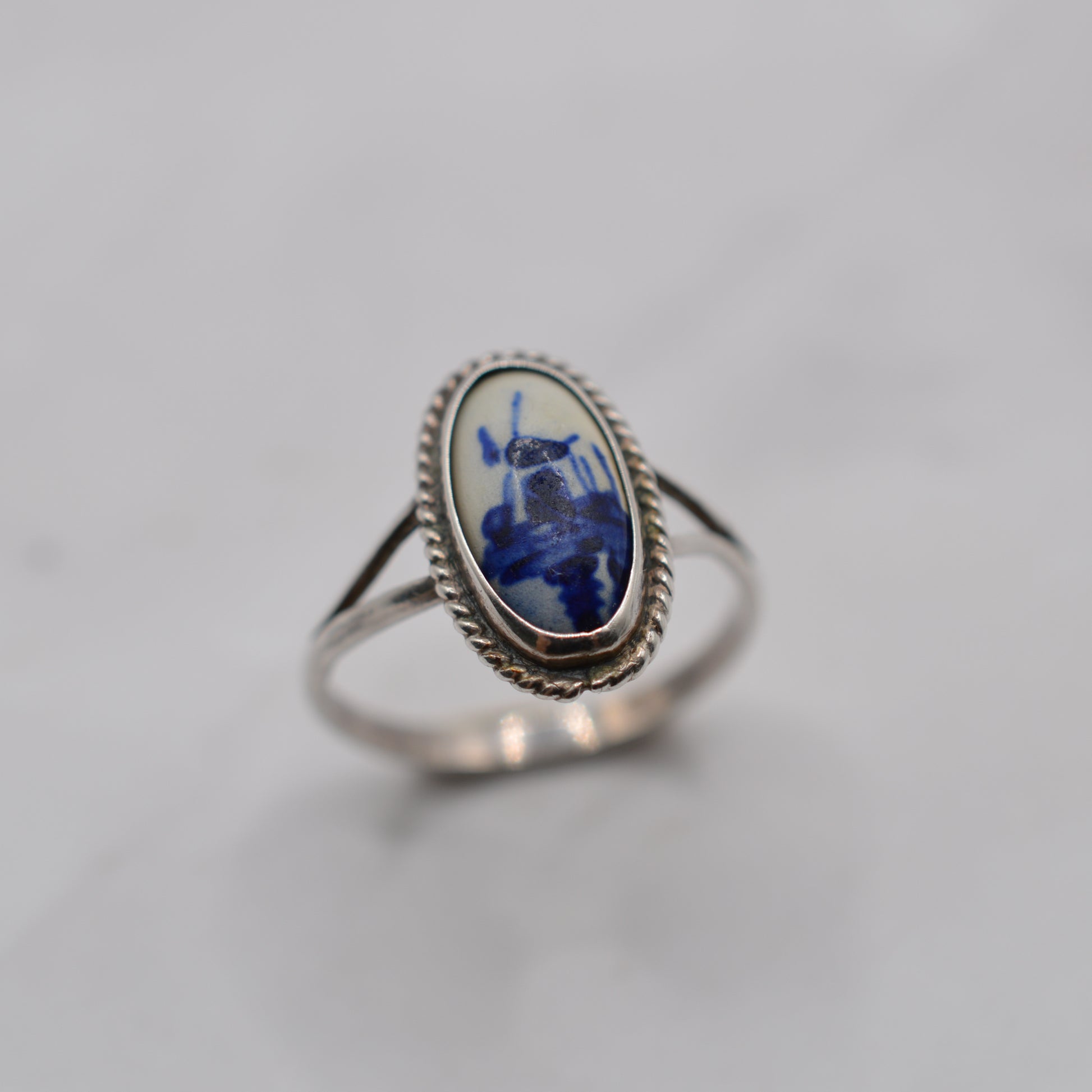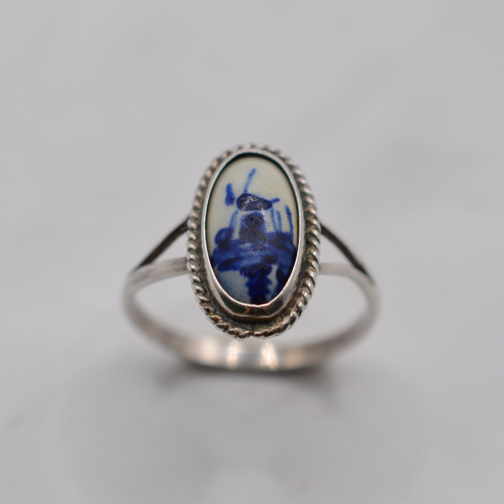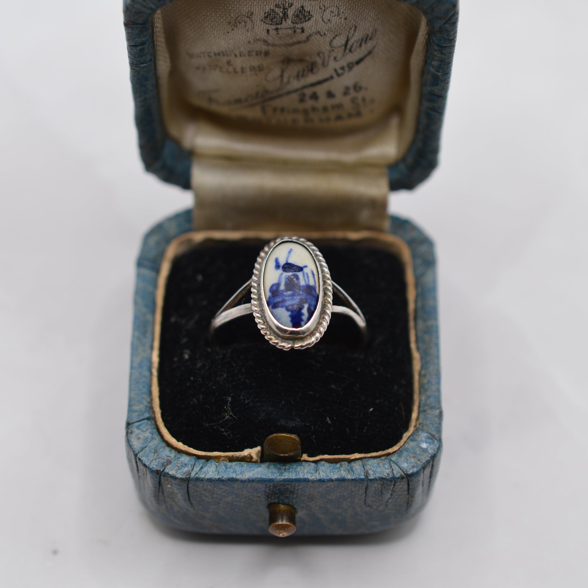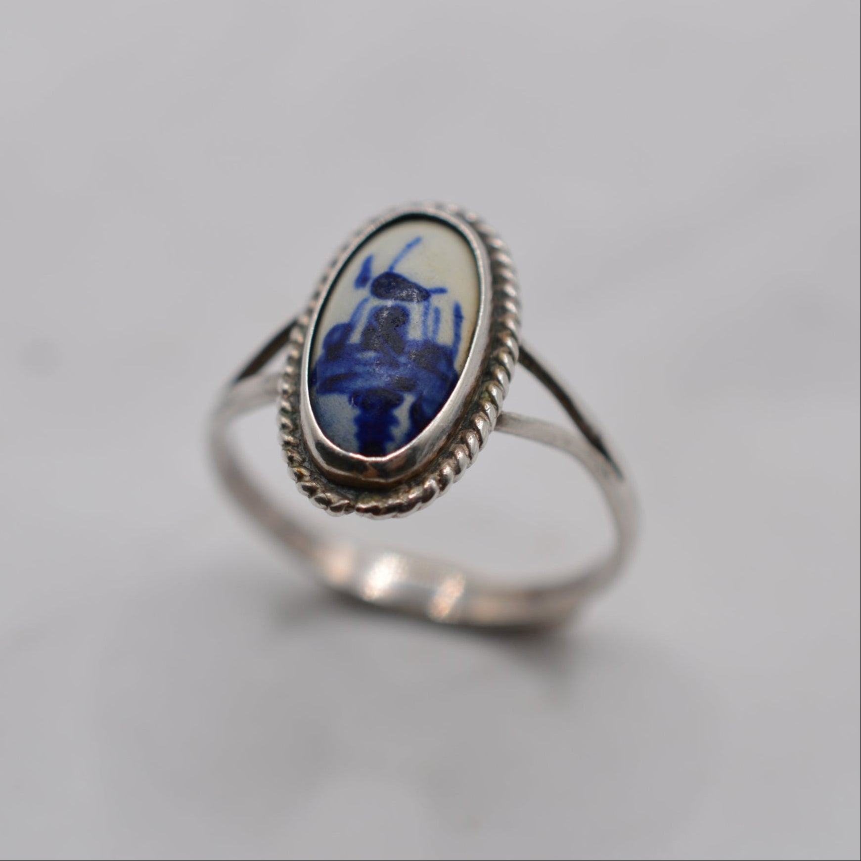 Vintage Delft Dutch Silver Blue & White Porcelain China Ring