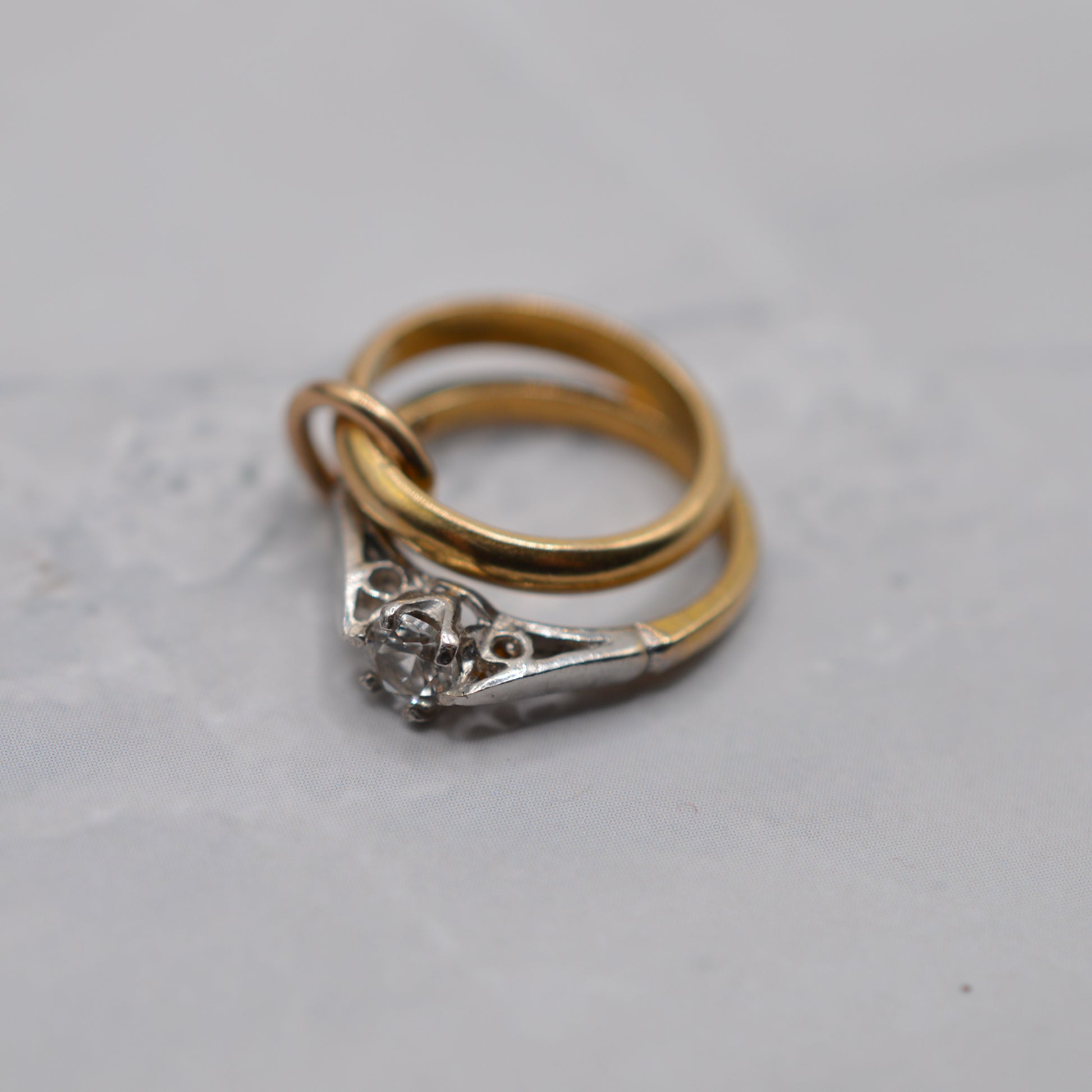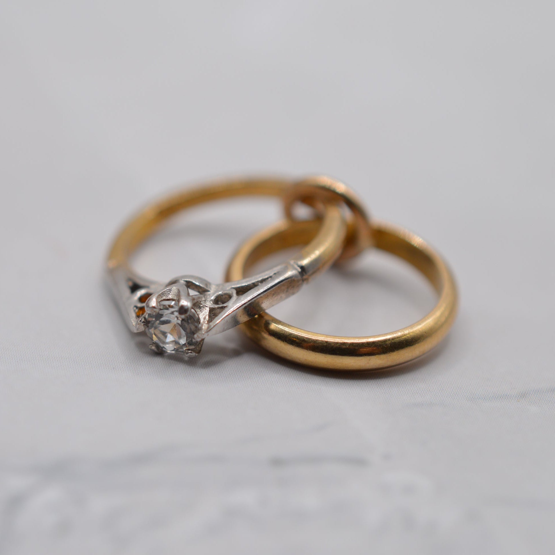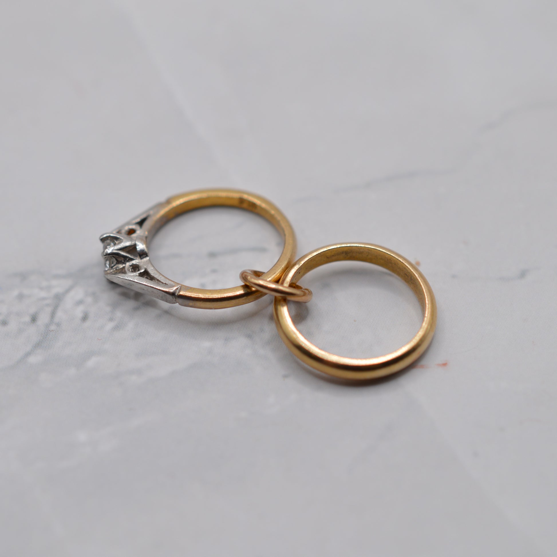 An utterly adorable 1960s 9ct gold wedding ring charm! This delightful vintage piece features two mini rings: a plain gold wedding band and a dainty engagement ring set with a sparkling white sapphire. This a perfect vintage gift for weddings, anniversaries or another romantic occasion. A lovely and rare little treasure to add to a charm bracelet or wear on a chain as a pendant.